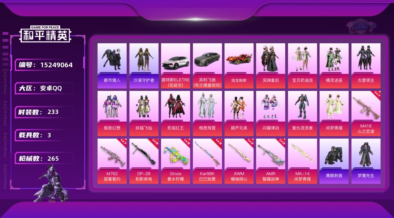 [15249064]素材身法号【特价急出/详情看图】:安卓 手Q-12粉装-8特效枪-3载具-4粉色飞行器-9.2w热力值-25王牌印记-233套装-265枪皮【热门品类】:套装-都市猎人,套装-沙漠守护者,套装-龟仙人,套装-暗影哥特,套装-粉红小猪,小恶魔头饰【粉色载具】:路特斯ELETRE(花绽灰),宾利飞驰(布罗德盖棕双色),焰龙咆哮【粉色套装】:粉装-深渊皇后,粉装-宝贝奶油派,粉装-精灵迷巫,粉装-古堡领主,粉装-极致幻想,粉装-扶摇飞仙,粉装-炙焰红王,粉装-相思残雪,粉装-葫芦兄弟,粉装-闪耀律动,角色-复仇流浪者,粉装-闲梦青缨【粉色枪皮等级】:M416-心之恋语(七级),GROZA-香水柠檬(五级),M762-甜蜜誓约(七级),Kar98K-巳巳如意(五级),AWM-橘柚倾心(二级),AMR-智耀战神(二级),DP-28-豹影疾电(五级)【粉色飞行器】:甜蜜誓约飞行器,星之彼岸飞行器,天之羽翼飞行器,幻梦音符飞行器
