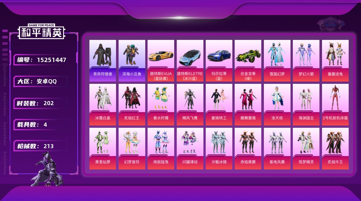 [15251447]素材身法号 安卓 手Q-31粉装-10特效枪-4载具-4粉色飞行器-9.9w热力值-14王牌印记-202套装-213枪皮【热门品类】:粉装-雪国幻梦,粉装-梦幻火箭,粉装-童趣迷兔,套装-浪漫天命,套装-深海小丑鱼,套装-小丑鱼,套装-奇异狩猎者,角色-军刀雅典娜,套装-龟仙人,套装-暗影哥特,套装-浪漫波比,套装-粉红小猪【粉色载具】:路特斯EVIJA(星际黄),路特斯ELETRE(冰川蓝),玛莎拉蒂Ghibli(蓝),合金龙骨(绿)【粉色套装】:粉装-雪国幻梦,粉装-梦幻火箭,粉装-冰霜白皇,粉装-童趣迷兔,粉装-炙焰红王,粉装-香水柠檬,粉装-飓风飞鹰,粉装-蜜桃特工,粉装-蝶舞蔷薇,角色-洛天依,粉装-海渊国主,角色-2号机款机体服,粉装-青葱仙萝,粉装-幻梦音符,粉装-绚丽摇曳,粉装-闪耀律动,粉装-冷魅冰骑,粉装-赤焰黑爵,粉装-紫电风暴,粉装-筑梦精灵,粉装-炙焰牛王,粉装-圣光天使,角色-复仇流浪者,粉装-绒雪飘舞,粉装-傲雪凌霜,粉装-霁雪冰心,粉装-彩虹甜喵,粉装-霞光圣骑,粉装-寒光使者,角色-烟云彩露,角色-奇迹舞步 美琪【粉色枪皮等级】:AKM-梦之光华(七级),SCAR-L-童趣迷兔(七级),SCAR-L-青春物语(五级),M416-五爪金龙(七级),UZI-筑梦精灵(七级),UMP45-雪国精灵(七级),Vector-环太平洋(七级),Kar98K-巳巳如意(五级),SLR-暗夜玫瑰(四级),DP-28-豹影疾电(四级)【粉色飞行器】:梦幻火箭飞行器,幻梦音符飞行器,冷魅冰骑飞行器,星夜魔法师飞行翼