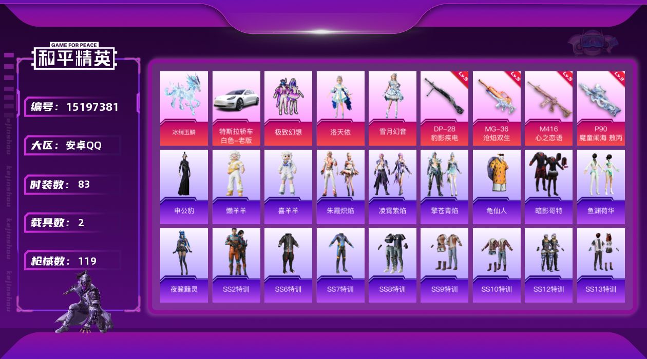 - [16969055]安卓 手Q-10粉装-9特效枪-1载具-6粉色飞行器-48079热力值-9王牌印记-99套装-154枪皮 【热门品类】:套装-红熊茄茄 【粉色套装】:角色-千金淑猫,角色-晶梦幻蝶,角色-樱桃泡泡,角色-荧海星豚,角色-绯穹魔姬,角色-奇迹舞步 贝贝,角色-奇迹舞步 美琪,角色-奇迹舞步 美雪,角色-羊梦糖心 【粉色枪皮等级】:汤姆逊-热量炸弹(五级),AKS-74U-森灵之息(五级),Kar98K-巳巳如意(五级),Mk14-樱桃泡泡(七级),M249-霁蓝缠春(五级),DP-28-千金淑猫(六级),DP-28-豹影疾电(五级) 【粉色载具】:九霄玄鹿 【粉色枪皮】:SCAR-L-灵驹仙姬,汤姆逊-热量炸弹,AKS-74U-森灵之息,Kar98K-巳巳如意,Mk14-樱桃泡泡,M249-霁蓝缠春,DP-28-千金淑猫,DP-28-豹影疾电 【粉色飞行器】:香车宝马飞行器,炫彩糖果飞行器,彩虹独角兽飞行器,绯月迷踪飞行器,奇迹舞步飞行器,云梦轻舟飞行器 【粉色降落伞】:江南烟雨降落伞,星梦奇缘降落伞,千金淑猫降落伞,临安公主降落伞,晶梦幻蝶降落伞,彩虹独角兽降落伞,樱桃泡泡降落伞,智耀战神降落伞,绯穹魔姬降落伞,奇迹舞步降落伞,喜羊羊与灰太狼降落伞,炫彩糖果降落伞,灵驹仙姬降落伞 【稀有套装】:套装-摩登天骄,套装-绒宝小鹅,套装-巳巳如意,套装-雪国风尚,套装-炫彩糖果,套装-火种守卫者,套装-糖糖葫芦,套装-青团波波,角色-都市丽猫,角色-摩登魅猫,套装-燕燕于飞,套装-鱼渊荷华,套装-晶辉守护,角色-糖霜甜心,角色-蜜桃派对,套装-粉恋花,套装-紫幽梦,套装-蓝冰羽,角色-瑰梦爱神,套装-星渊小夜曲,套装-云朵鹅,套装-雪绒豹,角色-玫纹锢梦,角色-黯羽织刑,套装-蜜露汐语,角色-夜瞳黯灵,套装-朱霞炽焰,套装-凌霄紫焰,玩偶服-懒羊羊,玩偶服-美羊羊,玩偶服-喜羊羊,角色-紫霄电母,角色-杯旋调茶师,角色-云端星象师,套装-红釉青花 【稀有枪皮】:F57-灵驹仙姬,SVD-灵驹仙姬,G36C-灵驹仙姬,AUG-冰晶雪宝,AKM-2P战斗服款,M16A4-千金淑猫,SCAR-L-炫彩节奏,SCAR-L-玉兔迎春,M416-红色方程式,M416-蓝色火焰,GROZA-晶梦幻蝶,AUG-耀粉歌者,M762-天降萌叽,M762-云朵鹅,ARX-凌霄紫焰,UZI-啾