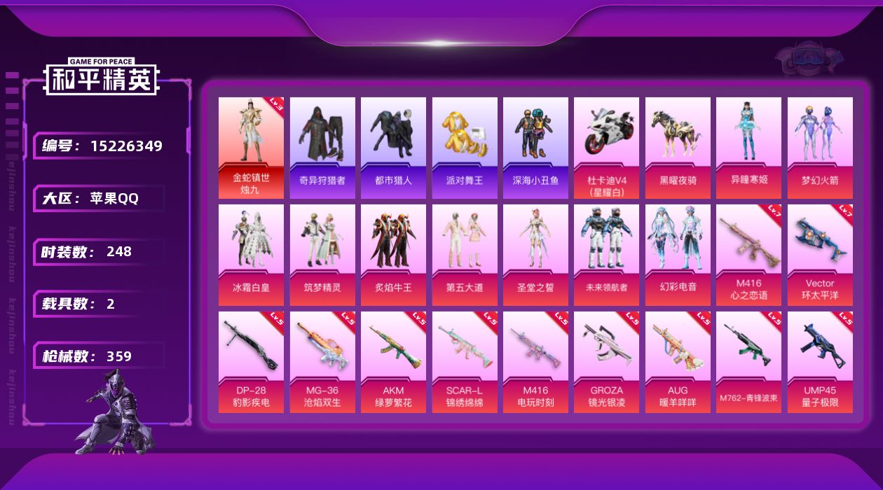 [15226349]【店主推荐捡漏号!可直接换绑】/素材身法号 苹果 手Q-1神装-9粉装-15特效枪-2载具-13粉色飞行器-11.7w热力值-20王牌印记-248套装-359枪皮【红色神装等级】:金蛇镇世-烛九(三级)【热门品类】:粉装-梦幻火箭,套装-浪漫天命,套装-都市猎人,套装-派对舞王,套装-深海小丑鱼,套装-小丑鱼,套装-奇异狩猎者,角色-军刀雅典娜,套装-忍者信条,角色-2P战斗服款,套装-龟仙人,套装-潮萌小黄鸭,套装-暗影哥特,套装-浪漫波比,套装-粉红小猪,角色-Mark.06【粉色载具】:杜卡迪 Panigale V4(星耀白),黑曜夜骑【粉色套装】:粉装-梦幻火箭,粉装-冰霜白皇,粉装-筑梦精灵,粉装-炙焰牛王,粉装-第五大道,角色-圣堂之誓,粉装-未来领航者,粉装-幻彩电音,角色-异瞳寒姬【粉色枪皮等级】:AKM-绿萝繁花(五级),SCAR-L-锦绣绵绵(五级),M416-心之恋语(七级),M416-电玩时刻(五级),M416-灵猫魔法师(三级),GROZA-镜光银凌(五级),AUG-暖羊咩咩(五级),M762-青锋波束(五级),UMP45-量子极限(五级),Vector-环太平洋(七级),汤姆逊-热量炸弹(五级),Kar98K-巳巳如意(五级),Mk14-甜梦熊击(五级),DP-28-豹影疾电(五级),MG-36-沧焰双生(五级)【粉色飞行器】:梦幻火箭飞行器,童趣迷兔飞行器,星夜魔法师飞行翼,闪光银龙飞行器,千面幻镜飞行器,镜光幻境飞行翼,沙丘之主天马,龙翔九天飞行器,月下星之子飞行器,灵猫魔法师飞行器