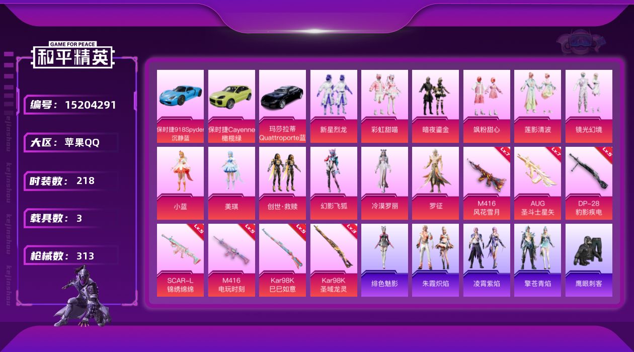 [15204291]【店主推荐捡漏号!可直接换绑】 苹果 手Q-12粉装-7特效枪-3载具-6粉色飞行器-10.1w热力值-17王牌印记-218套装-313枪皮【热门品类】:角色-军刀雅典娜,套装-龟仙人,套装-粉红小猪,角色-8号机,角色-Mark.06【粉色载具】:玛莎拉蒂Quattroporte(夜幕蓝),保时捷918 Spyder(沉静蓝),保时捷Cayenne(橄榄绿)【粉色套装】:粉装-新星烈龙,粉装-彩虹甜喵,粉装-暗夜鎏金,粉装-飒粉甜心,粉装-莲影清波,粉装-镜光幻境,角色-小蓝,角色-美琪,套装-创世·救赎,粉装-幻影飞狐,角色-冷漠罗丽,角色-罗征【粉色枪皮等级】:SCAR-L-锦绣绵绵(五级),M416-风花雪月(七级),M416-电玩时刻(五级),AUG-圣斗士星矢(七级),Kar98K-巳巳如意(五级),Kar98K-圣域龙灵(三级),DP-28-豹影疾电(五级)【粉色飞行器】:太空嘟嘟飞行器,镜域双华-灵镜之阶,龙翔九天飞行器,深渊漩涡飞行器,雀灵庇佑飞行器