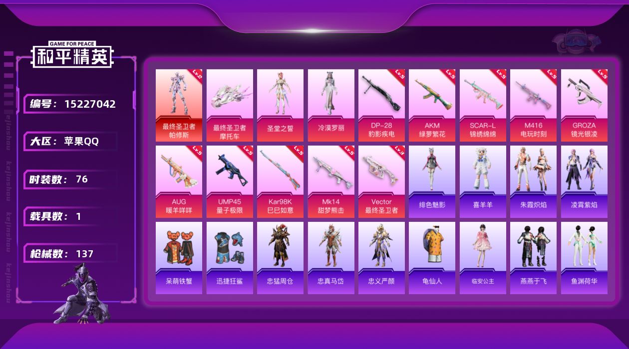 [15227042]【店主推荐捡漏号!可直接换绑】/素材身法号/绝世印记1/地铁满天赋 苹果 手Q-1神装-2粉装-10特效枪-1载具-2粉色飞行器-4.1w热力值-5王牌印记-76套装-137枪皮【红色神装等级】:最终圣卫者-帕修斯(二级)【热门品类】:角色-忠猛周仓,角色-忠真马岱,角色-忠义严颜,套装-龟仙人,大砍刀-青龙偃月刀,撬棍-龙胆亮银枪【粉色载具】:最终圣卫者摩托车【粉色套装】:角色-圣堂之誓,角色-冷漠罗丽【粉色枪皮等级】:AKM-绿萝繁花(五级),SCAR-L-锦绣绵绵(五级),M416-电玩时刻(五级),GROZA-镜光银凌(五级),AUG-暖羊咩咩(五级),UMP45-量子极限(五级),Vector-最终圣卫者(三级),Kar98K-巳巳如意(五级),Mk14-甜梦熊击(五级),DP-28-豹影疾电(五级)【粉色飞行器】:终晖之翼飞行器
