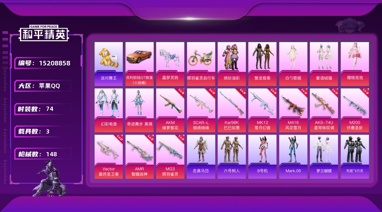 [15208858]【店主推荐捡漏号!可直接换绑】/素材身法号/璀璨碎片1202 苹果 手Q-7粉装-10特效枪-3载具-6粉色飞行器-4.8w热力值-1王牌印记-74套装-148枪皮【热门品类】:粉装-缤纷油彩,粉装-繁龙极客,套装-派对舞王,角色-忠真马岱,套装-六号树人,角色-8号机,角色-Mark.06【粉色载具】:宾利欧陆GT敞篷(火焰橘),晶梦灵驹,辉羽雀灵自行车【粉色套装】:粉装-缤纷油彩,角色-白勺歌姬,粉装-繁龙极客,粉装-蜜语绒猫,角色-樱桃泡泡,粉装-幻彩电音,角色-奇迹舞步 美琪【粉色枪皮等级】:AKM-绿萝繁花(五级),SCAR-L-锦绣绵绵(五级),M416-风花雪月(三级),Vector-最终圣卫者(二级),AKS-74U-星穹咏叹调(三级),Kar98K-巳巳如意(五级),AMR-智耀战神(二级),M200-伏羲圣卦(三级),MK12-雪月幻音(四级),MG3-辉羽雀灵(二级)【粉色飞行器】:镜光幻境飞行翼,繁龙极客飞行器,镜域双华-灵镜之阶,雀灵庇佑飞行器,幻星舰长飞行器,终晖之翼飞行器