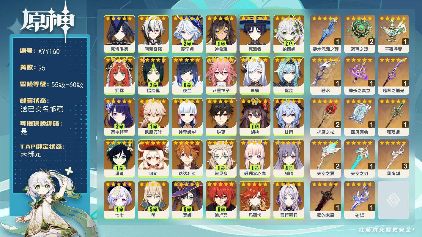 [15734182]【店主推荐捡漏号】60级/95黄/女主/32个五星角色/16个五星武器 0命克洛琳德,0命阿蕾奇诺,2命芙宁娜,1命迪希雅,0命流浪者,2命纳西妲,0命妮露,2命提纳里,满命夜兰,0命八重神子,0命申鹤,0命优菈,2命雷电将军,1命枫原万叶,0命神里绫华,0命钟离,1命胡桃,0命甘雨,1命温迪,0命可莉,0命达达利亚,1命阿贝多,1命珊瑚宫心海,4命刻晴,1命七七,5命琴,满命莫娜,满命迪卢克,0命玛薇卡,0命茜特菈莉,0命梦见月瑞希,0命丝柯克,精1静水流涌之辉,精2碧落之珑,精1千夜浮梦,精1若水,精1神乐之真意,精1薙草之稻光,精2护摩之杖,精1四风原典,精1和璞鸢,精2天空之翼,精1天空之刃,精3风鹰剑,精1狼的末路,精1苍耀
