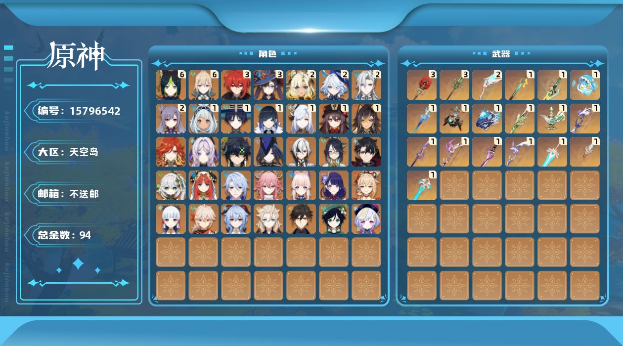 0命克洛琳德,0命阿蕾奇诺,0命闲云,2命芙宁娜,0命莱欧斯利,2命那维莱特,1命迪希雅,1命流浪者,0命纳西妲,0命妮露,满命提纳里,1命夜兰,0命神里绫人,0命八重神子,1命申鹤,0命雷电将军,0命枫原万叶,0命神里绫华,0命钟离,1命胡桃,0命甘雨,0命宵宫,0命温迪,0命阿贝多,0命珊瑚宫心海,2命刻晴,0命七七,满命琴,3命莫娜,3命迪卢克,0命基尼奇,2命希诺宁,1命玛拉妮,0命玛薇卡,0命茜特菈莉,0命菈乌玛,精1静水流涌之辉,精1金流监督,精1万世流涌大典,精1裁叶萃光,精1千夜浮梦,精1若水,精1薙草之稻光,精1飞雷之弦振,精1雾切之回光,精3护摩之杖,精3和璞鸢,精1天空之脊,精2天空之翼,精1阿莫斯之弓,精1天空之刃,精1天空之傲,精1岩峰巡歌,精1山王长牙,精1冲浪时光,精1纺夜天镜