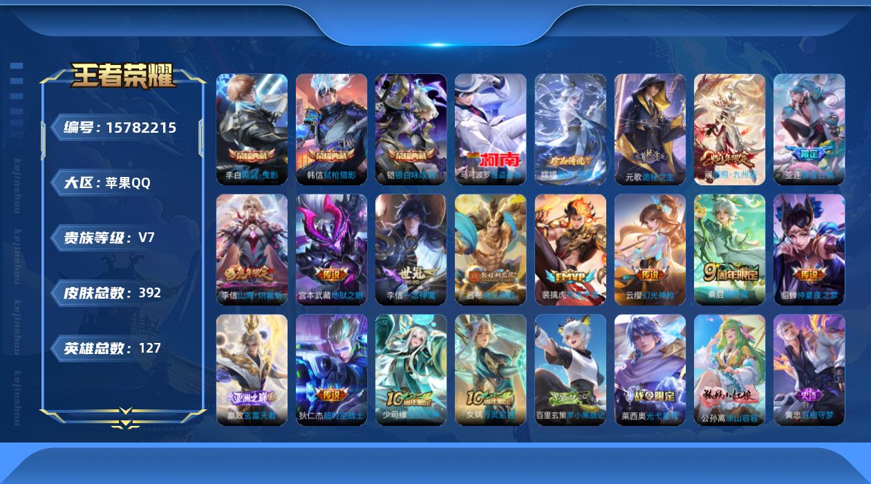 [15782215]苹果Q-V7-最强王者段位-127英雄-392皮肤-3典藏皮肤-2珍品传说-14传说-121史诗