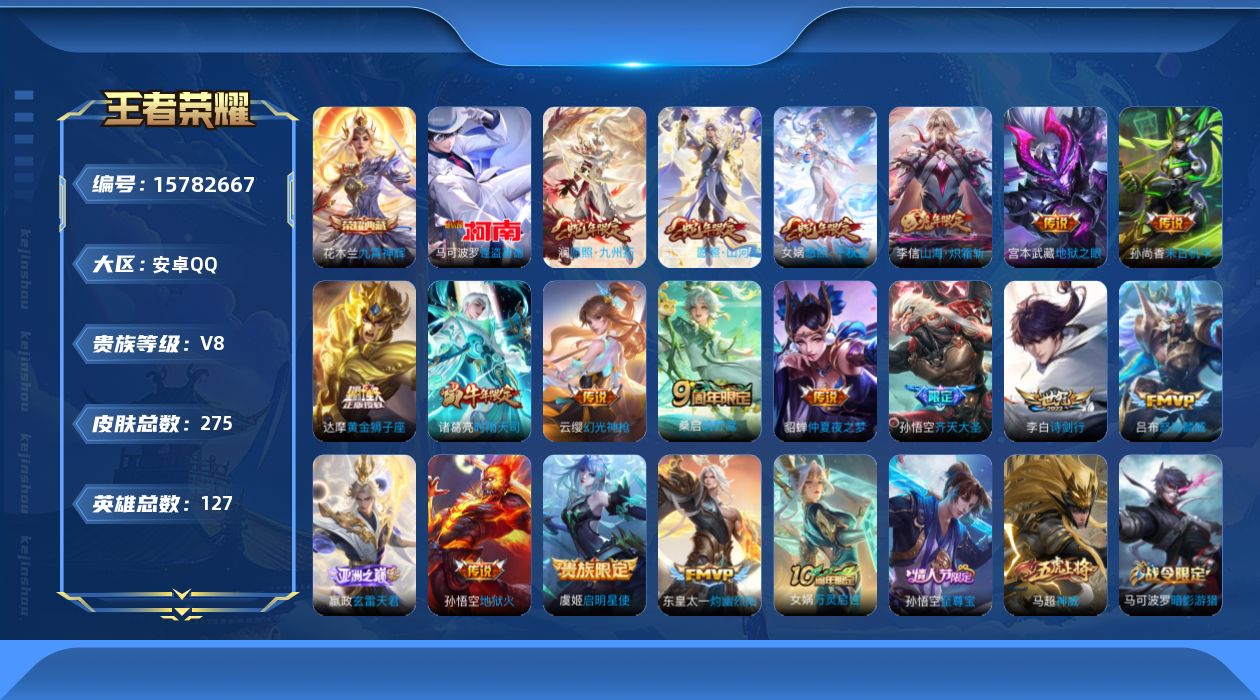 [15782667]安卓Q-275皮肤-1典藏皮肤-1珍品传说-19传说-70史诗