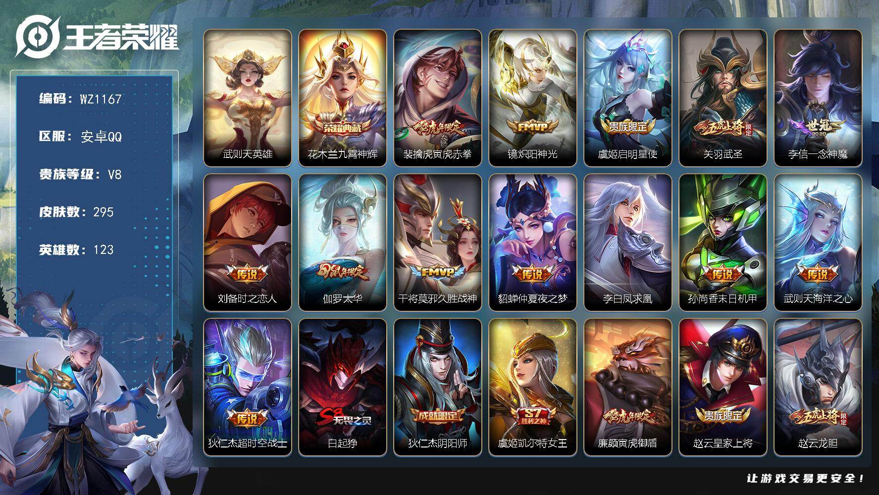 - [12134703]V10 4典藏 5无双 3珍品传说 75传说 126英雄 508皮肤 典藏英雄武则天 可修改实名 优质装备:无限飓风号(高达),鸣剑·曳影,全息碎影(猴子典藏),九霄神辉(木兰典藏),神器·明辉仪,青丘·九尾(妲己无双),花合斗,离恨烟(公孙离无双),器灵·螭龙剑,江户川柯南,怪盗基德,器灵·落星盏,黄金狮子座,冠军飞将,云鹰飞将(小将军),绛天战甲(鸡嘴战神),炽阳神光,一念神魔,云霓雀翎,末日机甲-孙尚香(绿蚂蚱),地狱火,仲夏夜之梦(大飞蛾),音你心动-小乔,零号·赤焰,地狱之眼,李逍遥,时之恋人-刘备(电焊工),游龙清影(小青龙),淬星耀世,超时空战士-狄仁杰,末日机甲-孙策,花朝如约(花篮子),挚爱之约,无双飞将,神器·狴犴令,神器·明辉仪,山海·炽霜斩(李信年限),山海·苍雷引(电光曜子),炽翼辉光(娃娃菜牛角包),画中仙,浮生妄,青丘·九尾,鹤羽星尊,妄想实况,惊梅引,遇见神鼓,小动物乐团,霜月吟,澜逐花归海,艾琳觅芳踪,琥珀纪元铠,琥珀纪元马超,黄金天蝎座,云中君群星魔术团,朵莉亚心动手记,牧神诗旅,涂山容容 传说皮:乘龙·问璇玑(孙尚香年限),乘龙·铭钟鼎(赵云年限),乘龙·淬吴钩(孙策年限),铠冥王哈迪斯,幻光神枪 珍宝阁皮:万物之道,优雅恋人,玩趣恶龙 限定皮:愿照·九州拓(澜年限),愿照·福禄聚(蔡文姬年限),愿照·岁时盈(虞姬年限),愿照·山河定(司空震年限),愿照·众生和(妲己年限),愿照·千秋盛(女娲年限),逐霄战戟,陌上桑,鸣野蒿,夏侯惇霜北刀,至尊宝,白虎志(电光耗子),凤求凰(白切鸡),梅西,武陵仙君(小桃花),异界灵契(白毛香),傲雪梅枪,白鹤梁神女,魔法小厨娘,白晶晶,时雨天司(水龙头),神威(电光马子),飞衡(韩信年限),无限倾心-项羽,瑞麟志(木兰年限),遇见飞天,高山流水,诗剑行,无限倾心-虞姬,齐天大圣,怒海麟威,五谷丰年,青龙志(铠年限),冰锋战神,武圣,天狼运算者,梁祝,御风骁将(吕布年限),龙胆,逐梦之星,岱宗(典韦年限),天狼溯光者,虎魄,奔雷神使(牛魔年限),祈雪灵祝(雪兔子),李小龙,逐梦之影,玄武志(苏烈年限),朱雀志(守约年限),永曜之星,辉光之辰,霸王别姬-项羽,霸王别姬-虞姬,默契交锋-兰陵王,默契交锋-花木兰,孙行者,猪悟能,一生所爱,大圣娶亲,引擎之心,天魔缭乱,冰霜恋舞曲,寅虎·御盾(廉