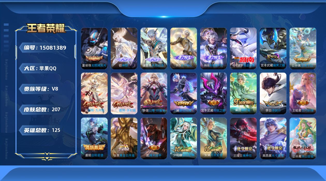 [15081389]【特价出售/店主推荐】苹果Q-V8-最强王者段位-125英雄-207皮肤-1典藏皮肤-4无双-1珍品传说-13传说-56史诗