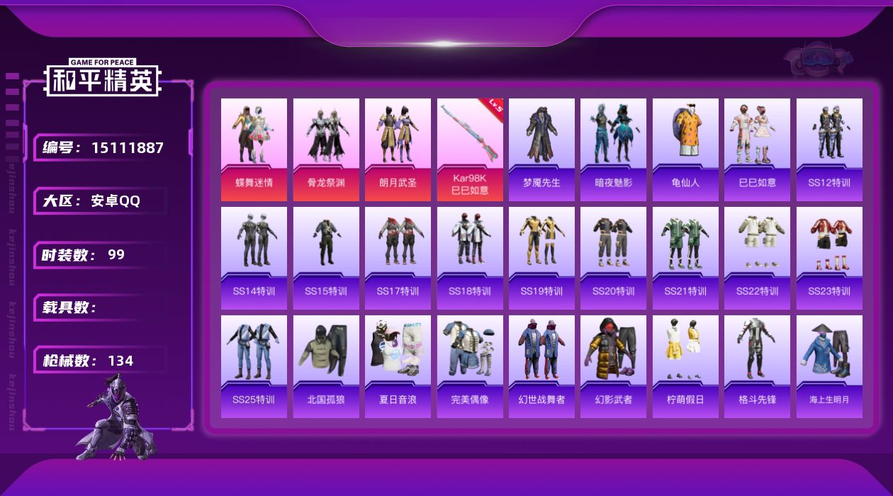 [15111887]【店主推荐捡漏号!可直接换绑】安卓 手Q-3粉装-1特效枪-0载具-1粉色飞行器-40535热力值-6王牌印记-99套装-134枪皮 【热门品类】:套装-龟仙人 【粉色套装】:粉装-蝶舞迷情,粉装-骨龙祭渊,粉装-朗月武圣 【粉色枪皮等级】:Kar98K-巳巳如意(五级) 【粉色枪皮】:Kar98K-巳巳如意 【粉色飞行器】:齐天大圣飞行器 【粉色降落伞】:焰龙焚天降落伞,暗夜玫瑰降落伞,洛神天依降落伞,海渊国主降落伞,蓝莓炮弹降落伞,流星咚咚降落伞,星夜魔法师降落伞,异瞳寒姬降落伞 【稀有套装】:套装-龟仙人,套装-巳巳如意 【稀有枪皮】:AKM-彩虹符号,AKM-星兔领航员,AKM-海渊国主,AKM-生命誓言,AKM-破晓战魂,AKM-萌趣颜团子,AKM-虎虎生威,AKM-龙的传人,M16A4-幻世战舞者,M16A4-甜心亚梦,M16A4-红色方程式,SCAR-L-流星咚咚,SCAR-L-炫彩节奏,SCAR-L-玉兔迎春,SCAR-L-龙宫之主,M416-糯团青竹,M416-红色方程式,M416-蓝色火焰,GROZA-异彩先驱,GROZA-治愈之星,GROZA-蓝莓炮弹,AUG-纯梦嫁纱,AUG-耀粉歌者,QBZ-彩虹符号,QBZ-飞驰魅影,M762-天降萌叽,M762-彩虹符号,M762-暗夜鎏金,M762-牛气冲天,M762-瑞龙福将,M762-镭射皇者,Mk47-妙红点点,Mk47-洛神天依,G36C-暗夜玫瑰,AC-VAL-天降萌叽,AC-VAL-甜心亚梦,蜜獾-娇憨猪猪,UZI-娇憨猪猪,UZI-炫彩节奏,UZI-红色方程式,UMP45-海渊国主,UMP45-灵符少年,UMP45-蓝色火焰,Vector-治愈之星,汤姆逊-天降萌叽,汤姆逊-异彩先驱,汤姆逊-暗夜鎏金,汤姆逊-炫彩节奏,MP5K-异彩先驱,MP5K-焰龙焚天,P90-飞驰魅影,Kar98K-彩虹符号,Kar98K-灵符少年,Kar98K-炫彩节奏,Kar98K-终极赛罗,Kar98K-飞驰魅影,M24-影袭,M24-治愈之星,M24-激战未来,M24-幻彩电音,AWM-不夜海上花,AWM-恐龙拽拽,SKS-炫彩节奏,SKS-青丘仙客,Mini14-异彩先驱,Mini14-春暖花开,Mini14-海渊国主,Mini14-耀粉歌者,Mini14-龙宫之主,Mk14-治愈之星,Win94-怪