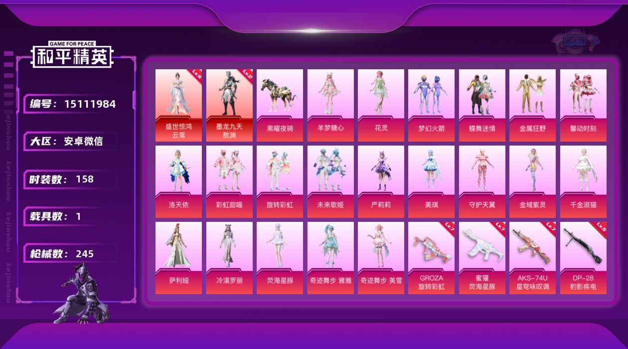【粉色枪皮等级】:M416-灵猫魔法师(三级),GROZA-旋转彩虹(七级),蜜獾-荧海星豚(七级),ARX-无垠阁(四级),AKS-74U-星穹咏叹调(七级),Kar98K-巳巳如意(五级),Mk14-盛世惊鸿(三级),DP-28-豹影疾电(五级),MG3-洛神天依(四级),MG3-辉羽雀灵(三级)