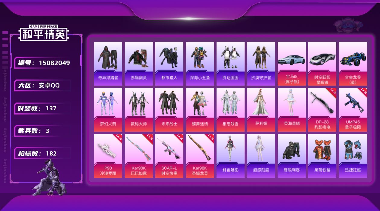 [15082049]【特价出售/店主推荐】地铁满天赋 安卓 手Q-7粉装-6特效枪-3载具-5粉色飞行器-56322热力值-9王牌印记-137套装-182枪皮【热门品类】:粉装-梦幻火箭,套装-浪漫天命,套装-赤蝎幽灵,套装-都市猎人,套装-深海小丑鱼,套装-小丑鱼,套装-奇异狩猎者,套装-胖达圆圆,套装-沙漠守护者,套装-忍者信条,套装-龟仙人,套装-暗影哥特,角色-Mark.06【粉色套装】:粉装-数码大师,粉装-未来战士,粉装-蝶舞迷情,粉装-梦幻火箭,粉装-相思残雪,角色-萨利娅,角色-荧海星豚【粉色枪皮等级】:SCAR-L-时空协奏(三级),UMP45-量子极限(五级),P90-冷漠罗丽(五级),Kar98K-巳巳如意(五级),Kar98K-圣域龙灵(三级),DP-28-豹影疾电(五级)【粉色载具】:宝马i8(离子银),时空跃影(星辉银),合金龙骨(蓝)【粉色枪皮】:SCAR-L-时空协奏,UMP45-量子极限,P90-冷漠罗丽,Kar98K-巳巳如意,Kar98K-圣域龙灵,DP-28-豹影疾电【粉色飞行器】:春暖花开飞行器,星夜魔法师飞行翼,深渊漩涡飞行器,圣域金龙飞行器