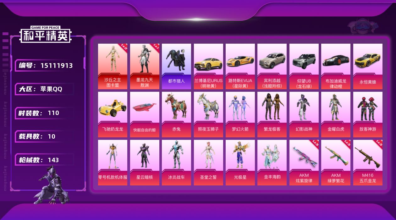 [15111913]【特价出售/店主推荐】苹果 手Q-2神装-11粉装-6特效枪-10载具-6粉色飞行器-5.9w热力值-3王牌印记-110套装-143枪皮 【红色神装等级】:墨龙九天-敖渊(一级),沙丘之主-图卡盟(二级) 【红色角色神装】:墨龙九天-敖渊,沙丘之主-图卡盟 【热门品类】:粉装-梦幻火箭,粉装-繁龙极客,套装-都市猎人,套装-金羽特工,套装-忍者信条,角色-忠猛周仓,角色-忠真马岱,角色-忠义严颜,套装-六号树人,套装-龟仙人,套装-暗影哥特,大砍刀-青龙偃月刀,撬棍-龙胆亮银枪 【粉色套装】:粉装-幻影战神,粉装-金曜白虎,粉装-梦幻火箭,粉装-放客神游,角色-零号机款机体服,角色-星云暗核,角色-冰炎战车,角色-圣堂之誓,粉装-繁龙极客,角色-光极星,粉装-金丰海韵 【粉色枪皮等级】:AKM-炫紫旋律(五级),AKM-绿萝繁花(五级),M416-五爪金龙(五级),M416-墨龙九天(三级),P90-沙丘之主(三级),Kar98K-巳巳如意(五级) 【粉色载具】:兰博基尼URUS(明艳黄),路特斯EVIJA(星际黄),宾利添越(浅瞪羚棕),仰望U8(龙石绿),布加迪威龙(律动橙),永恒黄蜂,飞驰奶龙龙,快艇-自由的鲸,赤兔,照夜玉狮子 【粉色枪皮】:AKM-炫紫旋律,AKM-绿萝繁花,M416-五爪金龙,M416-墨龙九天,P90-沙丘之主,Kar98K-巳巳如意 【粉色飞行器】:变形金刚飞行器,沙丘之主天马,繁龙极客飞行器,霓虹漫游飞行器,龙翔九天飞行器 【粉色降落伞】:幻影战神降落伞,梦幻火箭降落伞,天星战神降落伞,粉樱探戈降落伞,超新星降落伞,莲影清波降落伞,龙行天下降落伞,圣堂之誓降落伞,沙丘之主降落伞,猪猪侠降落伞,繁龙极客降落伞,精灵梦叶罗丽降落伞,墨龙九天降落伞,极意拳锋降落伞,炫彩糖果降落伞 【稀有套装】:套装-龟仙人,套装-雪国风尚,角色-绯色魅影,套装-炫彩糖果 【稀有枪皮】:AKM-影袭,AKM-灼热熔岩,AKM-破晓战魂,AKM-霓虹街区,AKM-龙的传人,M16A4-红色方程式,M16A4-莲影清波,SCAR-L-甜蜜旋律,SCAR-L-粉锦千层,M416-摩登王国,M416-糯团青竹,M416-蓝色火焰,GROZA-2B战斗服款,GROZA-影袭,AUG-幻影战神,AUG-黑白懵懵牛,M762-风花雪月,Mk47-摩登王国,Mk47-炫