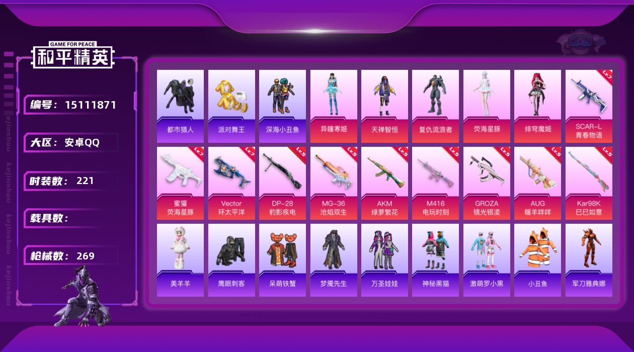[15111871]【店主推荐捡漏号!可直接换绑】地铁满天赋 安卓 手Q-5粉装-10特效枪-0载具-3粉色飞行器-83265热力值-16王牌印记-221套装-269枪皮