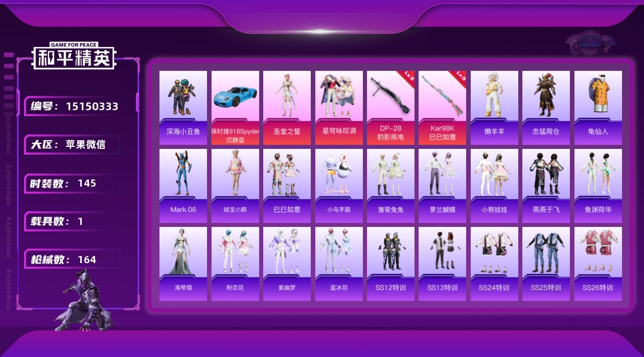 [15150333]【特价出售/店主推荐】苹果 微信-3粉装-2特效枪-1载具-2粉色飞行器-5.1w热力值-9王牌印记-145套装-164枪皮 【热门品类】:套装-深海小丑鱼,角色-忠猛周仓,套装-龟仙人,角色-Mark.06,大砍刀-青龙偃月刀 【粉色套装】:角色-圣堂之誓,粉装-星穹咏叹调 【粉色枪皮等级】:Kar98K-巳巳如意(五级),DP-28-豹影疾电(五级) 【粉色载具】:保时捷918 Spyder(沉静蓝) 【粉色枪皮】:Kar98K-巳巳如意,DP-28-豹影疾电 【粉色飞行器】:夜幕颂歌飞行器 【粉色降落伞】:绝对恒星降落伞,百万伏特降落伞,第五大道降落伞,未来歌姬降落伞,超新星降落伞,圣堂之誓降落伞,蜜语绒猫降落伞,忍者神龟降落伞,千金淑猫降落伞,喜羊羊与灰太狼降落伞,炫彩糖果降落伞 【稀有套装】:套装-龟仙人,套装-绒宝小鹅,套装-巳巳如意,套装-小鸟芋圆,套装-雏菊兔兔,套装-萝兰蝴蝶,套装-小熊娃娃,套装-燕燕于飞,套装-鱼渊荷华,角色-海琴烟,套装-粉恋花,套装-紫幽梦,套装-蓝冰羽,玩偶服-懒羊羊,套装-炫彩糖果 【稀有枪皮】:AUG-冰晶雪宝,AKM-锦绣火鲤,AKM-龙的传人,M16A4-红色方程式,M16A4-蓝色火焰,SCAR-L-夜灯,SCAR-L-炫彩节奏,SCAR-L-红色方程式,M416-糯团青竹,M416-红色方程式,M416-蓝色火焰,GROZA-懵萌河马,AUG-耀粉歌者,QBZ-原初圣火,M762-牛气冲天,M762-镭射皇者,M762-登顶巅峰,G36C-懵萌河马,G36C-星穹咏叹调,AC-VAL-快闪甜心,AC-VAL-闲梦青缨,蜜獾-天降萌叽,UZI-啾咪啾咪,UZI-天降萌叽,UZI-红色方程式,UZI-幻影飞狐,UMP45-繁龙极客,UMP45-炫光之旅,UMP45-生命誓言,UMP45-蓝色火焰,Vector-焰鹰斗篷,汤姆逊-天降萌叽,汤姆逊-耀粉歌者,AKS-74U-鬼刀,P90-快闪甜心,P90-巳巳如意,Kar98K-彩虹符号,Kar98K-红色方程式,Kar98K-诡娃娃,M24-幻彩电音,AWM-焰鹰斗篷,AWM-圣堂之誓,SKS-未来歌姬,VSS-彩虹符号,VSS-镭射皇者,Mini14-原初圣火,Mini14-耀粉歌者,SLR-四圣焕新,QBU-锦绣火鲤,莫辛纳甘-懵萌河马,M417-惊鸿侠骨,M