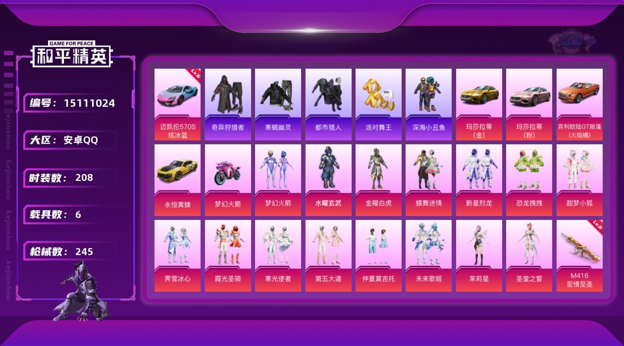 - [15613017]【店主推荐捡漏号!可直接换绑】素材身法号/老木乃伊/无敌战神框1/绝世印记2 苹果 手Q-无敌战神框-3神装-13粉装-12特效枪-8载具-8粉色飞行器-9.4w热力值-14王牌印记-158套装-229枪皮【红色载具】:保时捷Panamera(炽焰橙)(三级)【红色神装等级】:魔童闹海-敖丙(一级),魔童闹海-哪吒(三级),灵猫魔法师-塞维尔(一级)【热门品类】:粉装-怪诞乔克,粉装-雪国幻梦,粉装-梦幻火箭,套装-赤蝎幽灵,套装-都市猎人,套装-冥河战士,套装-深海小丑鱼,套装-小丑鱼,套装-奇异狩猎者,套装-金羽特工,套装-龟仙人,套装-暗影哥特【粉色载具】:玛莎拉蒂Ghibli(粉),迈凯伦570S(天际蓝),保时捷Panamera(炽焰橙),Formula E Gen2(幽光蓝),踏焰逐风摩托车,僚机-冰龙团团,黑曜夜骑,冰绡玉鳞【粉色套装】:粉装-怪诞乔克,粉装-甜心巧克力,粉装-宝贝奶油派,粉装-天使彩虹糖,粉装-雪国幻梦,粉装-梦幻火箭,粉装-薄荷物语,粉装-炫光之旅,角色-千金淑猫,粉装-星穹咏叹调,角色-冰魄,角色-羊梦糖心,角色-异瞳寒姬【粉色枪皮等级】:AKM-炫紫旋律(七级),SCAR-L-魔童闹海 哪吒(三级),M416-心之恋语(七级),M416-灵猫魔法师(三级),蜜獾-异瞳寒姬(三级),AKS-74U-无垠阁(三级),P90-魔童闹海 敖丙(三级),Kar98K-巳巳如意(五级),DP-28-豹影疾电(五级),MG-36-沧焰双生(五级),平底锅-喜羊羊与灰太狼(三级)【粉色飞行器】:星空武士飞行器,脆鲨七海飞行器,万象金身飞行器,灵猫魔法师飞行器,飞天猪飞行器,灵珠游龙飞行器