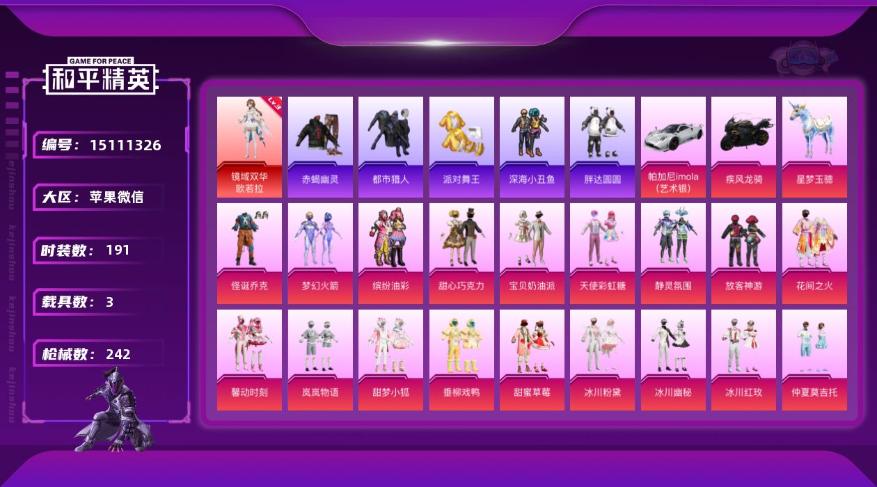 [15111326]【特价出售/店主推荐】苹果 微信-1神装-30粉装-10特效枪-3载具-14粉色飞行器-98504热力值-10王牌印记-191套装-242枪皮