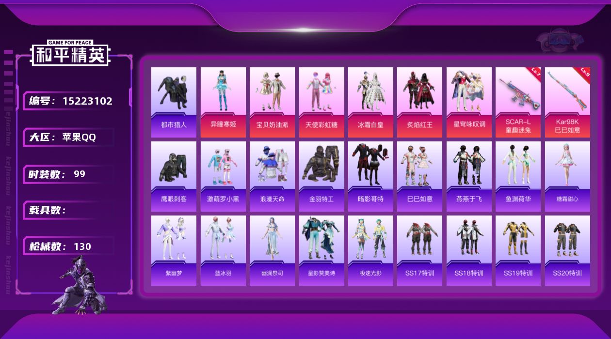 - PX_2061726- 苹果手Q-21王牌印记-12粉装-7特效枪-5载具-101007热力值-220套装-263枪皮-3卓越印记-1传奇印记 【12粉装】,初号机 觉醒Ver.,缤纷油彩,繁龙极客,怪诞乔克,智耀战神,光极星,蓝莓炮弹,深海曼妙,圣堂之誓,绚金战神,幻影战神,齐天大圣 【7特效枪】AKM-炫紫旋律-7级 M416-墨龙九天-3级 M416-心之恋语-7级 Kar98K-巳巳如意-