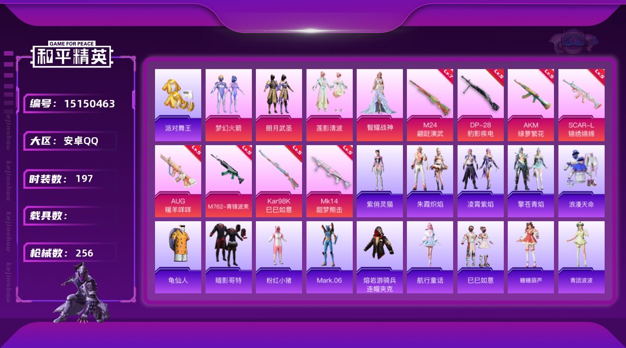 - [15296983]【店主推荐捡漏号!可直接换绑】安卓 微信-无敌战神框-3粉装-4特效枪-0载具-3粉色飞行器-35508热力值-4王牌印记-96套装-117枪皮【热门品类】:套装-金羽特工,套装-龟仙人,套装-红红火火【粉色套装】:粉装-天星战神,角色-阿尔茜,角色-猩猩队长【粉色枪皮等级】:AKM-梦之光华(五级),M416-五爪金龙(五级),Kar98K-巳巳如意(三级),DP-28-豹影疾电(四级)【粉色枪皮】:AKM-梦之光华,M416-五爪金龙,Kar98K-巳巳如意,DP-28-豹影疾电【粉色飞行器】:拂晓神骑飞行器,极意拳锋飞行器