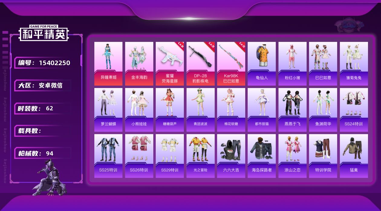 [15402250]【特价出售/店主推荐】安卓 微信-2粉装-3特效枪-0载具-0粉色飞行器-25292热力值-5王牌印记-62套装-94枪皮 【热门品类】:套装-龟仙人,套装-粉红小猪 【粉色套装】:粉装-金丰海韵,角色-异瞳寒姬 【粉色枪皮等级】:蜜獾-荧海星豚(六级),Kar98K-巳巳如意(五级),DP-28-豹影疾电(五级) 【粉色枪皮】:蜜獾-荧海星豚,Kar98K-巳巳如意,DP-28-豹影疾电 【粉色降落伞】:星之彼岸降落伞,千金淑猫降落伞 【稀有套装】:套装-龟仙人,套装-巳巳如意,套装-雏菊兔兔,套装-萝兰蝴蝶,套装-小熊娃娃,套装-糖糖葫芦,套装-青团波波,套装-棉花软糖,角色-都市丽猫,套装-燕燕于飞,套装-鱼渊荷华 【稀有枪皮】:AKM-破晓战魂,AKM-缤纷海域,AKM-龙的传人,SCAR-L-夜灯,SCAR-L-炫彩节奏,M416-糯团青竹,M416-蓝色火焰,AUG-耀粉歌者,M762-天降萌叽,蜜獾-天降萌叽,UZI-啾咪啾咪,UZI-红色方程式,UMP45-夜灯,UMP45-涂山之恋,UMP45-生命誓言,Vector-生命誓言,汤姆逊-天降萌叽,汤姆逊-炫彩节奏,汤姆逊-耀粉歌者,P90-巳巳如意,SKS-炫彩节奏,SKS-迅猛狂鲨,VSS-彩虹符号,Mini14-春暖花开,Mini14-涂山之恋,Mini14-耀粉歌者,M417-惊鸿侠骨,M417-猪猪侠,M200-惊鸿侠骨,S686-彩虹符号,S686-生命誓言,S686-红色方程式,S686-巳巳如意,S686-千金淑猫,S1897-戏水时光,S12K-玩趣呆呆,S12K-夜灯,DBS-月影灵韵,M249-彩虹符号,MG3-惊鸿侠骨,蝎式手枪-闲梦青缨,爆炸猎弓-惊鸿侠骨,破片手榴弹-巳巳如意 【其他套装】:套装-SS24特训,套装-SS25特训,套装-SS26特训,套装-SS29特训,套装-光之冒险,套装-六六大吉,套装-海岛探路者,套装-涂山之恋,套装-特训学院,套装-猛禽,套装-甜蜜告白,套装-白色伏地魔,套装-竞技名士,套装-粉红小猪,套装-绮丽涂鸦,套装-绯格组合,套装-缤纷果语,套装-荣耀,套装-野性山猫,套装-长空猛禽,套装-霓虹街区,套装-青玉碎影,套装-魅力单车,套装-黄色伏地魔,套装-黑色伏地魔,套装-龙的传人,套装-龟仙人,套装-天籁歌者,套装-竞技角斗士,套装-惊鸿