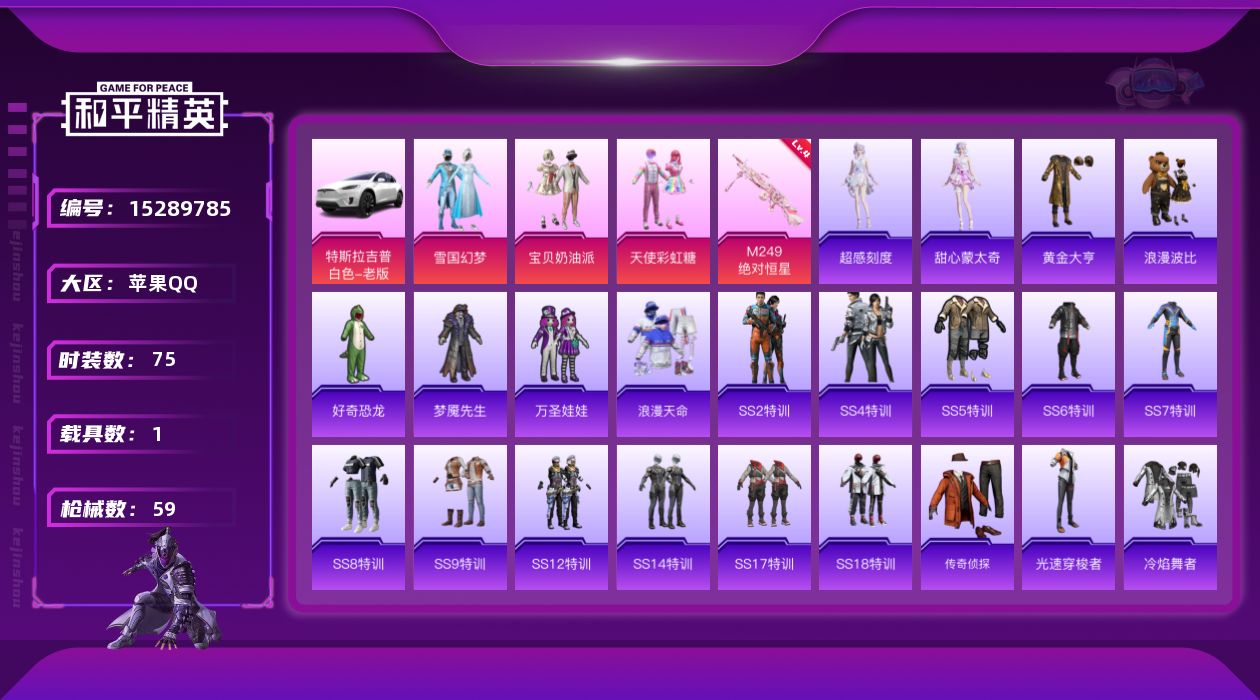 [15289785]【特价出售/店主推荐】苹果 手Q-3粉装-1特效枪-1载具-1粉色飞行器-2.2w热力值-1王牌印记-75套装-59枪皮 【热门品类】:粉装-雪国幻梦,套装-浪漫天命,套装-黄金大亨,套装-浪漫波比 【粉色套装】:粉装-宝贝奶油派,粉装-天使彩虹糖,粉装-雪国幻梦 【粉色枪皮等级】:M249-绝对恒星(四级) 【粉色载具】:特斯拉Model X(珍珠白) 【粉色枪皮】:M249-绝对恒星 【粉色飞行器】:绝对恒星飞行器 【粉色降落伞】:绝对恒星降落伞,甜心宝贝降落伞,炫紫旋律降落伞 【稀有套装】:角色-超感刻度,角色-甜心蒙太奇,套装-雪国风尚 【稀有枪皮】:AKM-冰凉西瓜,M16A4-红色方程式,SCAR-L-雷霆特警,GROZA-异彩先驱,AUG-耀粉歌者,AUG-绝对恒星,QBZ-神秘黑猫,QBZ-诡娃娃,M762-甜心宝贝,M762-诡娃娃,UZI-众神之王,UZI-幻影战神,UZI-炫彩节奏,UMP45-诡娃娃,Vector-PEL轰鸣竞梦者,Vector-生命誓言,汤姆逊-异彩先驱,MP5K-众神之王,MP5K-异彩先驱,MP5K-蓝莓炮弹,M24-众神之王,SKS-诡娃娃,VSS-未来战士,VSS-粉色回忆,VSS-雷霆特警,Mini14-异彩先驱,SLR-众神之王,S1897-春暖花开,DP-28-彩虹符号,DP-28-未来战士,DP-28-清新柠檬,DP-28-甜心宝贝,P92-雷霆特警,蝎式手枪-欢乐香蕉,突击盾牌-绝对恒星 【其他套装】:套装-SS2特训,套装-SS4特训,套装-SS5特训,套装-SS6特训,套装-SS7特训,套装-SS8特训,套装-SS9特训,套装-SS12特训,套装-SS14特训,套装-SS17特训,套装-SS18特训,套装-传奇侦探,套装-光速穿梭者,套装-冷焰舞者,套装-北国孤狼,套装-半糖蓝莓,套装-好奇恐龙,套装-完美偶像,套装-格斗先锋,套装-浪漫天命,套装-燃烧卡路里,套装-牛气满满,套装-特战装甲,套装-特种空勤,套装-特训学院,套装-狂战萌兔,套装-玉兔迎春,套装-甜蜜熊情侣,套装-疯狂小兔子,套装-白色伏地魔,套装-破蛋小黄鸡,套装-福星高照,套装-空投萌叽,套装-竞技勇士朋克,套装-竞技达人朋克,套装-耀粉歌者,套装-虎虎生威吉莉,套装-街头潮人,套装-跃动心情,套装-野性战魂,套装-长空猛禽,套装-