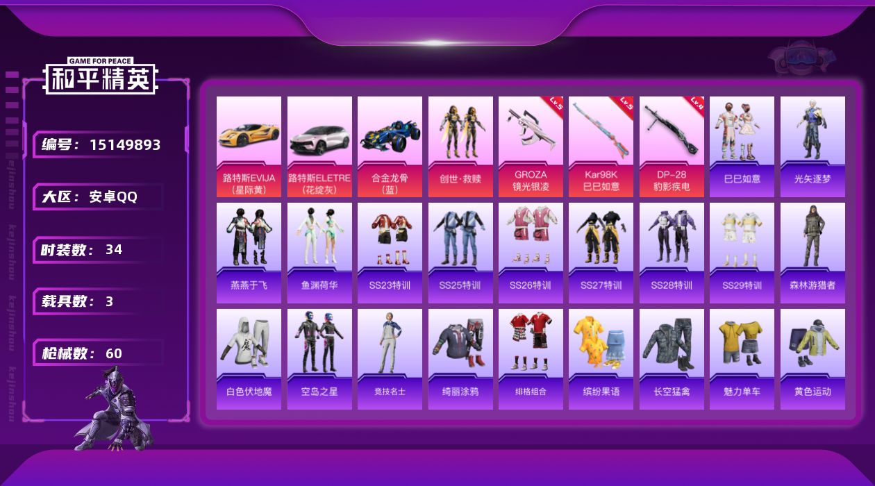 [15149893]【特价出售/店主推荐】 安卓 手Q-1粉装-3特效枪-3载具-0粉色飞行器-17284热力值-2王牌印记-34套装-60枪皮 【粉色套装】:套装-创世·救赎 【粉色枪皮等级】:GROZA-镜光银凌(五级),Kar98K-巳巳如意(五级),DP-28-豹影疾电(四级) 【粉色载具】:路特斯EVIJA(星际黄),路特斯ELETRE(花绽灰),合金龙骨(蓝) 【粉色枪皮】:GROZA-镜光银凌,Kar98K-巳巳如意,DP-28-豹影疾电 【粉色降落伞】:千金淑猫降落伞,极意拳锋降落伞 【稀有套装】:套装-巳巳如意,角色-光矢逐梦,套装-燕燕于飞,套装-鱼渊荷华 【稀有枪皮】:SCAR-L-红色方程式,M416-糯团青竹,AUG-天降萌叽,M762-天降萌叽,M762-登顶巅峰,蜜獾-天降萌叽,UZI-天降萌叽,UZI-影袭,UMP45-蓝色火焰,UMP45-绒宝小鹅,Vector-治愈之星,Vector-生命誓言,汤姆逊-天降萌叽,P90-巳巳如意,AWM-圣堂之誓,SKS-炫彩节奏,SKS-糯团青竹,SKS-青瓷战姬,Mini14-炫彩节奏,Mini14-绯穹魔姬,AMR-鬼刀,MK20-H-樱桃泡泡,S12K-破晓战魂,DBS-圣堂之誓,DBS-月影灵韵,DP-28-彩虹符号,MG3-幻世战舞者,破片手榴弹-巳巳如意 【其他套装】:套装-SS23特训,套装-SS25特训,套装-SS26特训,套装-SS27特训,套装-SS28特训,套装-SS29特训,套装-森林游猎者,套装-白色伏地魔,套装-空岛之星,套装-竞技名士,套装-绮丽涂鸦,套装-绯格组合,套装-缤纷果语,套装-长空猛禽,套装-魅力单车,套装-黄色运动,套装-纯真浪花,套装-热情海星,套装-创世·追猎 【稀有头盔】:金羽特工头盔(1级) 【营地ID】:968979194