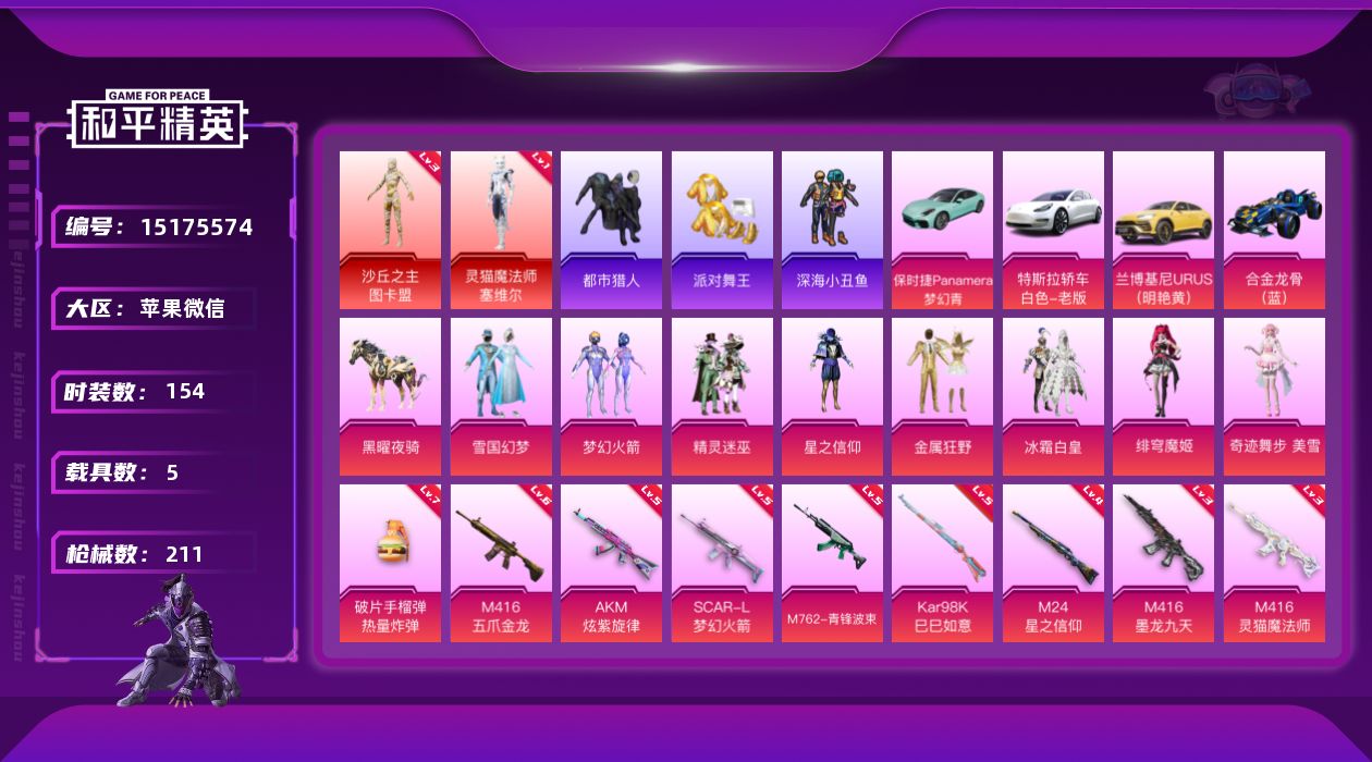 [15175574]【特价出售/店主推荐】苹果 微信-无敌战神框-2神装-8粉装-11特效枪-5载具-7粉色飞行器-83216热力值-14王牌印记-154套装-211枪皮