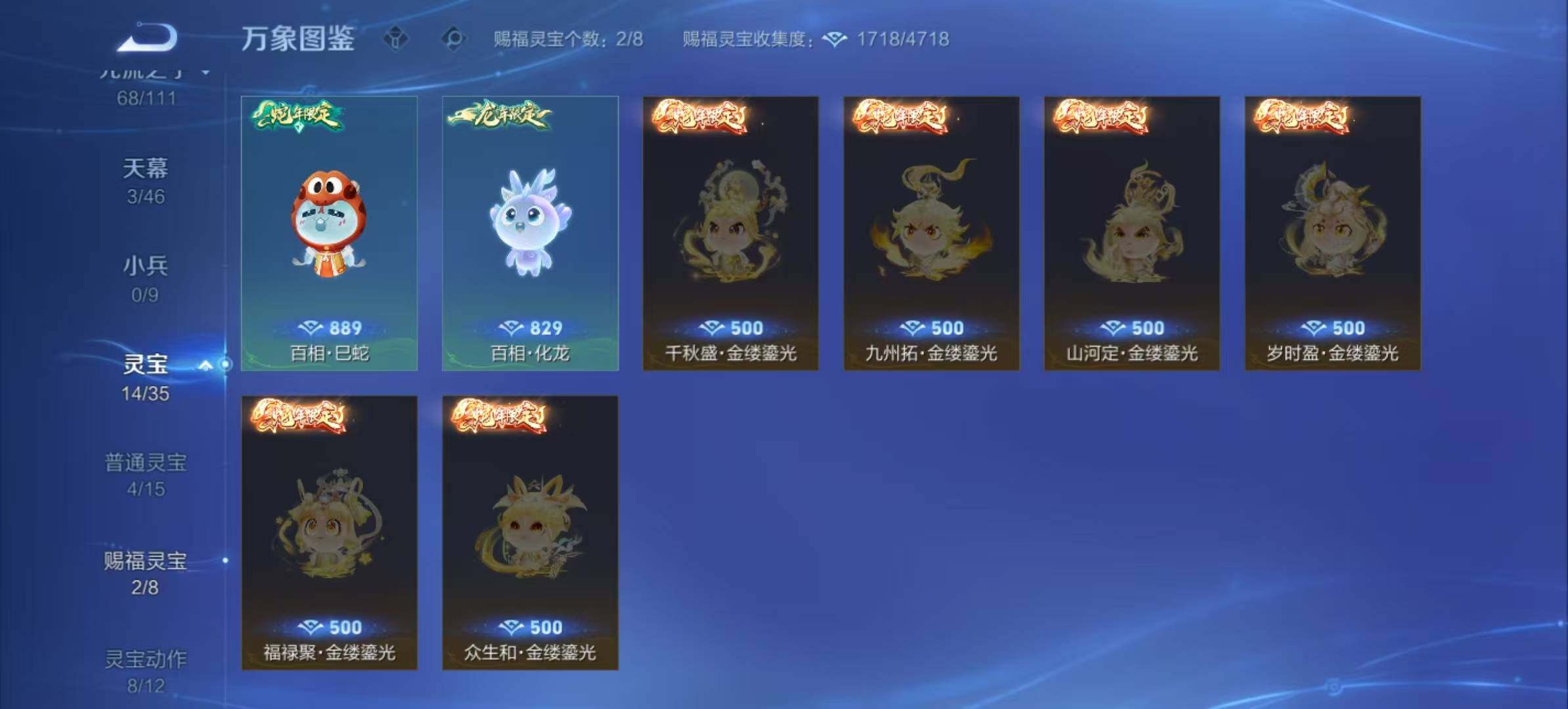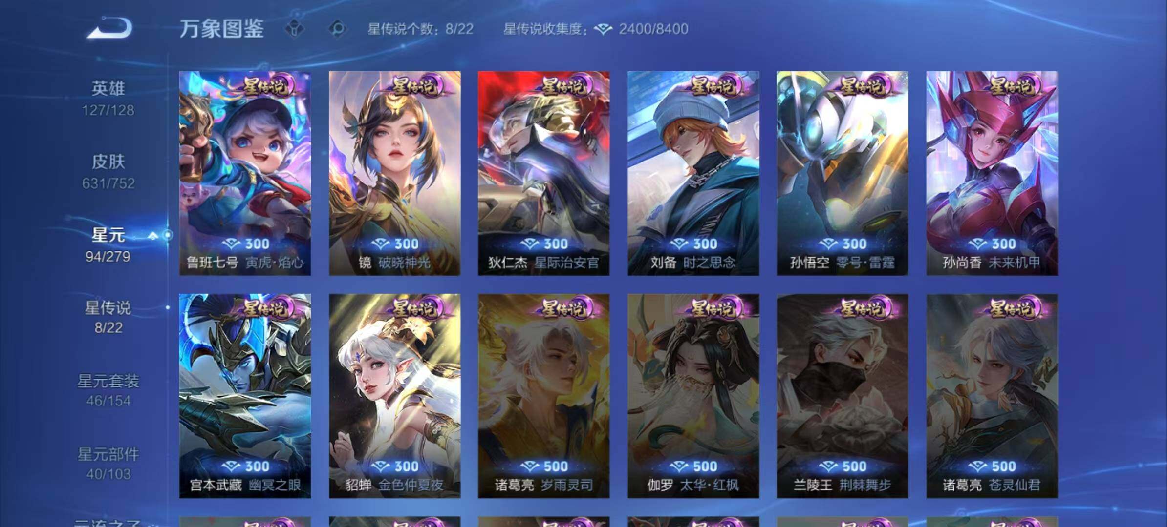 孙膑妖精王,扁鹊炼金王,虞姬凯尔特女王,白起狰,太乙真人饕餮,曹操烛龙,芈月重明,典韦穷奇,狂铁御狮,米莱狄御霄,牛魔御旌,盾山御銮,夏侯惇朔风刀,明世隐疑决卦,老夫子醍醐杖,鬼谷子原初探秘者,狄仁杰万华元夜,程咬金演武夺筹,钟馗驱傩正仪,苏烈千军破阵,吕布猎兽之王,嬴政白昼王子,女娲朔望之晖,典韦蓝屏警告,钟馗神迹守卫,鲁班七号狮舞东方,沈梦溪星空之诺,李元芳银河之约,刘邦夺宝奇兵,马可波罗暗影游猎,蒙犽狂想玩偶喵,元歌云间偶戏,弈星混沌棋,达摩沙漠行僧,兰陵王金庭之子,沈梦溪大漠名商,李元芳云中旅人,桑启海盐诗旅,裴擒虎擒涛扼浪,鲁班大师探海日志,张良古海寻踪,项羽苍威无极,镜青焰无极