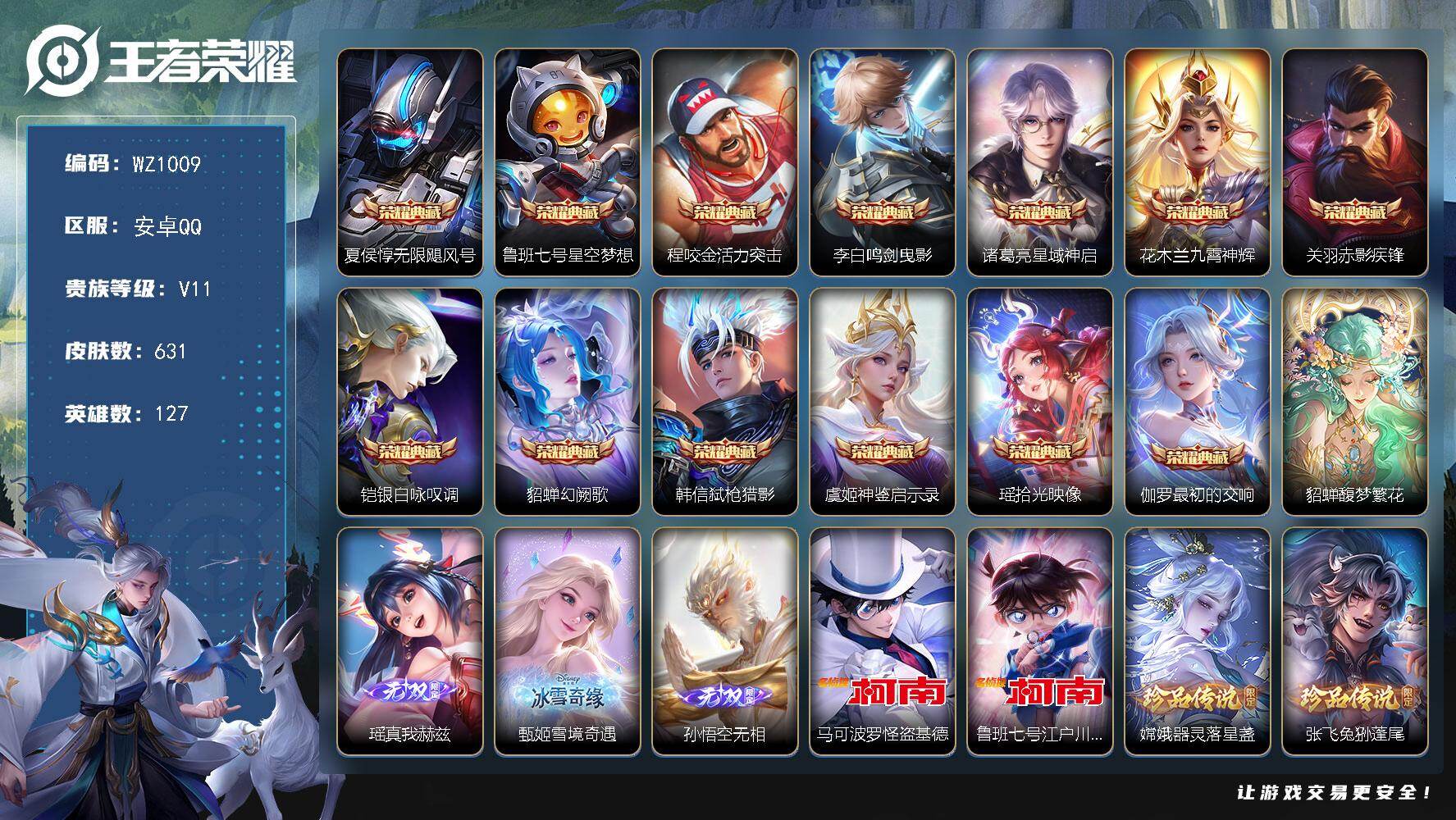 [15783141]安卓Q-V11-631皮肤-13典藏皮肤-1珍品无双-3无双-6珍品传说-87传说-215史诗 【英雄全皮】:廉颇全皮,赵云全皮,墨子全皮,嬴政全皮,鲁班七号全皮,刘禅全皮,高渐离全皮,阿轲全皮,扁鹊全皮,白起全皮,夏侯惇全皮,马可波罗全皮,达摩全皮,关羽全皮,程咬金全皮,露娜全皮,刘邦全皮,孙权全皮,张良全皮,娜可露露全皮,刘备全皮,张飞全皮,李元芳全皮,钟馗全皮,杨玉环全皮,苍全皮,鬼谷子全皮,黄忠全皮,百里玄策全皮,百里守约全皮,沈梦溪全皮,狂铁全皮,米莱狄全皮,李信全皮,盾山全皮,猪八戒全皮,上官婉儿全皮,亚连全皮,嫦娥全皮,马超全皮,西施全皮,鲁班大师全皮,蒙恬全皮,阿古朵全皮,夏洛特全皮,司空震全皮,赵怀真全皮,戈娅全皮,空空儿全皮,影全皮,海诺全皮,少司缘全皮 【荣耀典藏】:夏侯惇无限飓风号,鲁班七号星空梦想,程咬金活力突击,李白鸣剑曳影,诸葛亮星域神启,花木兰九霄神辉,关羽赤影疾锋,铠银白咏叹调,貂蝉幻阙歌,韩信弑枪猎影,虞姬神鉴启示录,瑶拾光映像,伽罗最初的交响 【珍品无双】:貂蝉馥梦繁花 【无双皮肤】:瑶真我赫兹,甄姬雪境奇遇,孙悟空无相 【珍品传说】:马可波罗怪盗基德,鲁班七号江户川柯南,嫦娥器灵落星盏,张飞兔狲蓬尾,瑶大耳狗之梦,安琪拉酷洛米之心 【传说皮肤】:后羿神树通天,公孙离云诺千山,西施续相思,杨玉环星之鸣奏,司空震愿照山河定,女娲愿照千秋盛,妲己愿照众生和,澜愿照九州拓,蔡文姬愿照福禄聚,虞姬愿照岁时盈,云缨幻光神枪,裴擒虎祥瑞亨通,嬴政玄雷天君,王昭君映山客,桑启鸣野蒿,庄周牧神诗旅,夏侯惇霜北刀,铠冥王哈迪斯,云中君群星魔术团,墨子黄金天蝎座,亚连落雪白狼,吕布曦玄引,貂蝉曦玄引,典韦战鼓燎原,孙尚香乘龙问璇玑,孙策乘龙淬吴钩,赵云乘龙铭钟鼎,马超琥珀纪元,艾琳觅芳踪,露娜霜月吟,甄姬至美化雀舞,大乔时之奇旅,鲁班七号时之奇旅,上官婉儿妄想奇谈,马可波罗妄想实况,东皇太一灼幽烈阳,诸葛亮鹤羽星尊,张飞百相守梦,夏洛特浮生妄,孙悟空齐天大圣,小乔山海琳琅生,曜山海苍雷引,李信山海炽霜斩,狄仁杰神器狴犴令,不知火舞绯月行,王昭君星穹之声,百里守约碎云,娜可露露前尘镜,孙尚香音你闪耀,马可波罗深海之息,马超无双飞将,露娜启示之音,蔡文姬花朝如约,孙策末日机甲,鲁班七号寅虎瑞焰,孙尚香异界灵契,赵云淬星耀世,王昭君乞巧织情,西施游龙清