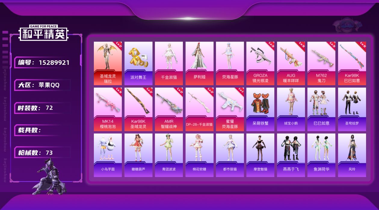 [15289921]【特价出售/店主推荐】苹果 手Q-1神装-3粉装-9特效枪-0载具-1粉色飞行器-28183热力值-3王牌印记-72套装-73枪皮