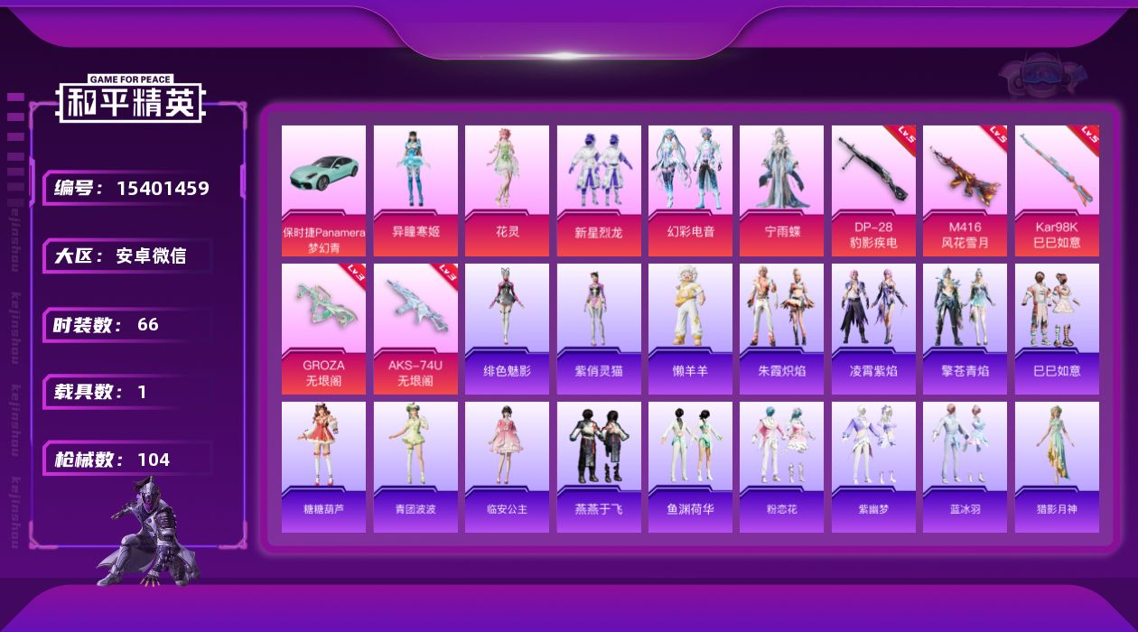 [15401459]【特价出售/店主推荐】安卓 微信-5粉装-5特效枪-1载具-2粉色飞行器-32128热力值-5王牌印记-66套装-104枪皮 【粉色套装】:粉装-新星烈龙,粉装-幻彩电音,角色-宁雨蝶,角色-花灵,角色-异瞳寒姬 【粉色枪皮等级】:M416-风花雪月(五级),GROZA-无垠阁(三级),AKS-74U-无垠阁(三级),Kar98K-巳巳如意(五级),DP-28-豹影疾电(五级) 【粉色载具】:保时捷Panamera(梦幻青) 【粉色枪皮】:M416-风花雪月,GROZA-无垠阁,AKS-74U-无垠阁,Kar98K-巳巳如意,DP-28-豹影疾电 【粉色飞行器】:无垠阁飞行器 【粉色降落伞】:绝对恒星降落伞,脆鲨七海降落伞,月影灵韵降落伞,鬼刀降落伞,圣斗士星矢降落伞,星穹咏叹调降落伞,幻星舰长降落伞,冷漠罗丽降落伞,绯穹魔姬降落伞,无垠阁降落伞,喜羊羊与灰太狼降落伞,异瞳寒姬降落伞,炫彩糖果降落伞 【稀有套装】:套装-巳巳如意,套装-雪国风尚,套装-糖糖葫芦,套装-青团波波,角色-临安公主,套装-燕燕于飞,套装-鱼渊荷华,套装-粉恋花,套装-紫幽梦,套装-蓝冰羽,角色-猎影月神,套装-星渊小夜曲,套装-极速光影,套装-彩虹兔,套装-云朵鹅,套装-雪绒豹,角色-乐音,角色-绛羽幽主,套装-朱霞炽焰,套装-凌霄紫焰,套装-擎苍青焰,玩偶服-懒羊羊,角色-绯色魅影,角色-紫俏灵猫,套装-炫彩糖果 【稀有枪皮】:AKM-影袭,AKM-星之彼岸,AKM-破晓战魂,SCAR-L-黄金龙骨,M416-蓝色火焰,AUG-耀粉歌者,M762-彩虹符号,M762-云朵鹅,M762-登顶巅峰,G36C-星穹咏叹调,ARX-凌霄紫焰,UZI-啾咪啾咪,UMP45-极意拳锋,JS9-凌霄紫焰,P90-巳巳如意,SKS-棋盘冕主,AMR-喜羊羊与灰太狼,SVD-云朵鹅,S686-巳巳如意,S12K-玩趣呆呆,S12K-智耀战神,DBS-彩虹符号,SPAS-12-云朵鹅,M249-彩虹符号,M249-绯穹魔姬,MG3-幻世战舞者,MG-36-凌霄紫焰,P92-凌霄紫焰,R45-幻彩电音,短管霰弹-竹节火铳,短管霰弹-星穹咏叹调,沙漠之鹰-云朵鹅,爆炸猎弓-喜羊羊与灰太狼,大砍刀-云朵鹅,大砍刀-鬼刀,平底锅-凌霄紫焰,平底锅-无垠阁,破片手榴弹-巳巳如意 【其他套装】:套装-旭日情侣,套装-