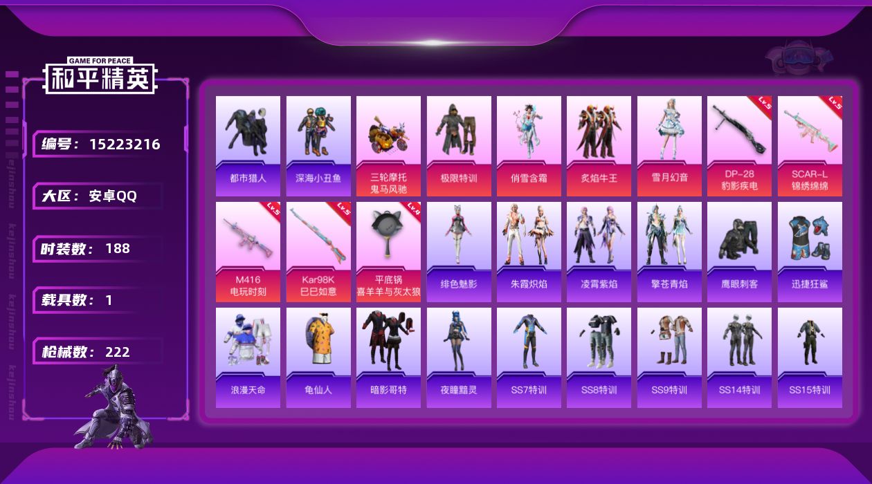 [15223216]安卓 手Q-4粉装-5特效枪-1载具-1粉色飞行器-68758热力值-14王牌印记-188套装-222枪皮 【热门品类】:套装-浪漫天命,套装-都市猎人,套装-深海小丑鱼,套装-龟仙人,套装-暗影哥特 【粉色套装】:粉装-极限特训,粉装-俏雪含霜,粉装-炙焰牛王,粉装-雪月幻音 【粉色枪皮等级】:SCAR-L-锦绣绵绵(五级),M416-电玩时刻(五级),Kar98K-巳巳如意(五级),DP-28-豹影疾电(五级),平底锅-喜羊羊与灰太狼(四级) 【粉色载具】:鬼马风驰 【粉色枪皮】:SCAR-L-锦绣绵绵,M416-电玩时刻,Kar98K-巳巳如意,DP-28-豹影疾电,平底锅-喜羊羊与灰太狼 【粉色飞行器】:齐天大圣飞行器 【粉色降落伞】:极限特训降落伞,荒野猎神降落伞,精灵迷巫降落伞,PEL轰鸣竞梦者降落伞,阿狸红降落伞,银刃赛罗降落伞,星之彼岸降落伞,烈焰拳霸降落伞,筑梦精灵降落伞,甜梦小狐降落伞,垂柳戏鸭降落伞,飒粉甜心降落伞,猪猪侠降落伞,江南烟雨降落伞,精灵梦叶罗丽降落伞,喜羊羊与灰太狼降落伞,炫彩糖果降落伞 【稀有套装】:套装-龟仙人,角色-夜瞳黯灵,套装-朱霞炽焰,套装-凌霄紫焰,套装-擎苍青焰,角色-绯色魅影 【稀有枪皮】:AKM-夜灯,AKM-彩虹符号,AKM-影袭,AKM-恐龙拽拽,AKM-灼热熔岩,AKM-王牌投手,AKM-生命誓言,AKM-百万伏特,AKM-破晓战魂,AKM-虎虎生威,AKM-霓虹街区,M16A4-幻世战舞者,M16A4-甜心亚梦,M16A4-魔法学院,SCAR-L-夜灯,SCAR-L-暗夜玫瑰,SCAR-L-玉兔迎春,SCAR-L-红色方程式,M416-红色方程式,M416-蓝色火焰,M416-魔法学院,GROZA-异彩先驱,GROZA-影袭,GROZA-治愈之星,GROZA-田园牧歌,GROZA-黑色刀锋,AUG-凝视深渊,AUG-天降萌叽,AUG-耀粉歌者,AUG-青春冒险家,AUG-魔法学院,QBZ-彩虹符号,QBZ-飞驰魅影,M762-天降萌叽,M762-奇异狩猎者,M762-彩虹符号,M762-深海曼妙,M762-瑞龙福将,Mk47-百万伏特,Mk47-青春冒险家,G36C-时空追击者,G36C-暗夜玫瑰,AC-VAL-天降萌叽,AC-VAL-快闪甜心,AC-VAL-甜心亚梦,蜜獾-天降萌叽,ARX-凌霄紫焰