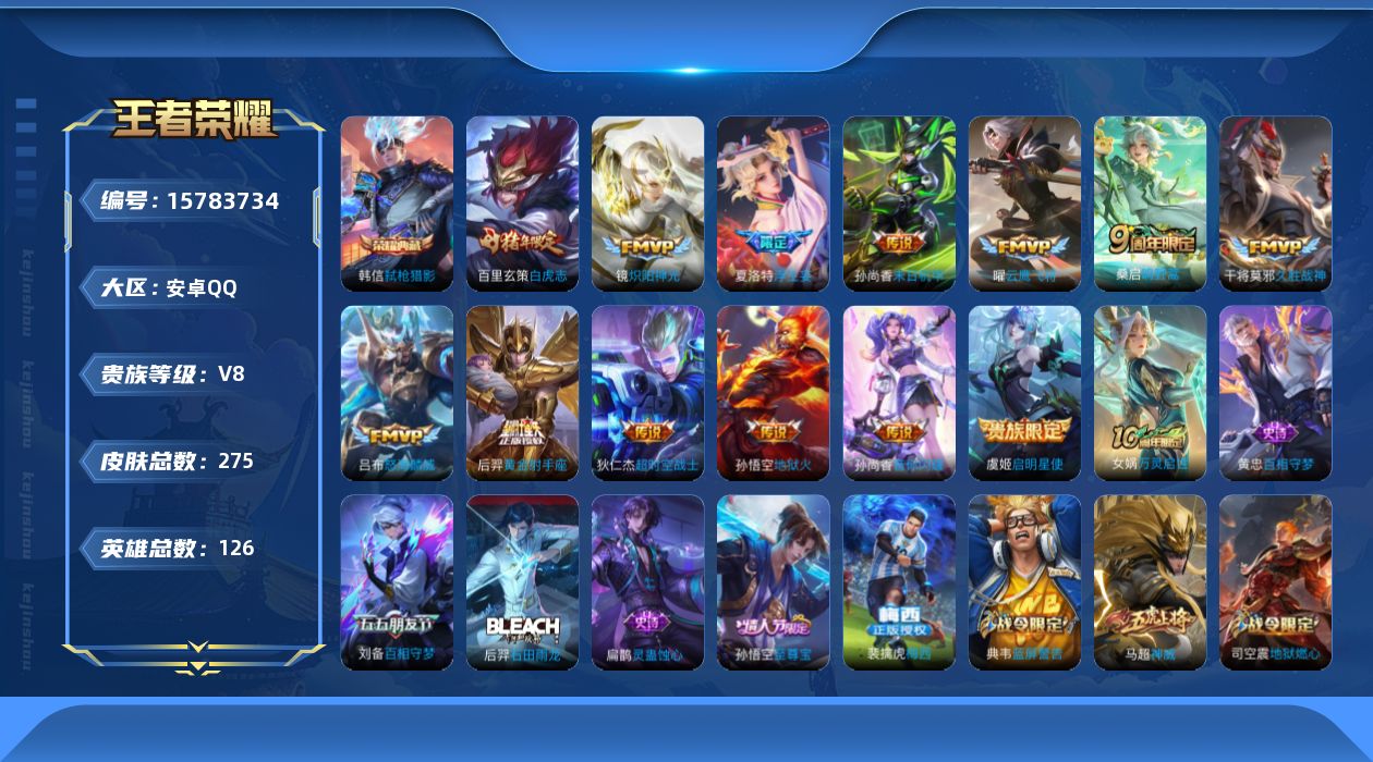 [15783734]安卓Q-V8-最强王者段位-126英雄-275皮肤-1典藏皮肤-14传说-80史诗