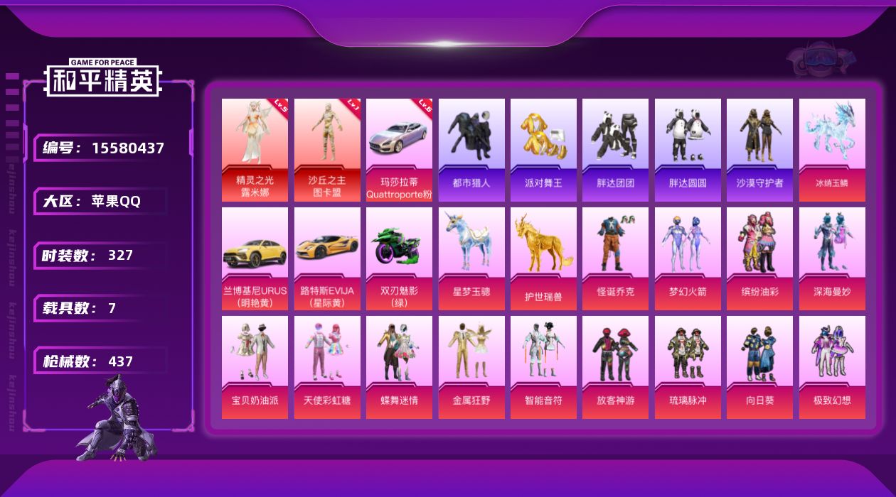 [15580437]【特价出售/店主推荐】 苹果 手Q-无敌战神框-3神装-29粉装-25特效枪-7载具-16粉色飞行器-181017热力值-27王牌印记-327套装-437枪皮【红色载具】:玛莎拉蒂Quattroporte(幻星粉)(六级)【红色神装等级】:暮色玫影-艾丽娅(一级),精灵之光-露米娜(五级),沙丘之主-图卡盟(一级)【红色角色神装】:暮色玫影-艾丽娅,精灵之光-露米娜,沙丘之主-图卡盟【热门品类】:粉装-怪诞乔克,粉装-梦幻火箭,粉装-缤纷油彩,套装-浪漫天命,套装-都市猎人,套装-派对舞王,套装-胖达团团,套装-胖达圆圆,套装-沙漠守护者,套装-AG战队服,角色-2P战斗服款,套装-龟仙人,套装-潮萌小黄鸭,套装-浪漫波比,套装-粉红小猪,套装-糯粉咩咩,套装-红熊茄茄【粉色套装】:粉装-深海曼妙,粉装-怪诞乔克,粉装-宝贝奶油派,粉装-天使彩虹糖,粉装-蝶舞迷情,粉装-梦幻火箭,粉装-金属狂野,粉装-智能音符,粉装-缤纷油彩,粉装-放客神游,粉装-琉璃脉冲,粉装-向日葵,粉装-极致幻想,粉装-黄蜂伯爵,粉装-翡翠骑士,粉装-冰霜白皇,粉装-香水柠檬,粉装-星之彼岸,角色-洛天依,粉装-薄荷物语,粉装-暖熊萌萌,粉装-千面幻镜,粉装-仲夏莫吉托,粉装-飒粉甜心,角色-圣堂之誓,角色-千金淑猫,角色-狂魅哈莉,角色-绯穹魔姬,角色-霁蓝缠春【粉色枪皮等级】:AKM-炫紫旋律(七级),AKM-梦之光华(一级),SCAR-L-童趣迷兔(六级),SCAR-L-纯梦嫁纱(一级),M416-心之恋语(六级),M416-风花雪月(二级),M416-墨龙九天(六级),GROZA-香水柠檬(六级),GROZA-精灵之光(三级),AUG-南国舞曲(五级),AUG-星梦奇缘(三级),M762-甜蜜誓约(五级),UZI-畅跳缤纷(五级),Vector-绯穹魔姬(四级),AKS-74U-信仰神谕(四级),P90-能量风暴(五级),Kar98K-伏魔团(三级),Kar98K-巳巳如意(五级),Kar98K-圣域龙灵(三级),Mini14-龙虾霸霸(七级),Mk14-盛世惊鸿(三级),DP-28-千金淑猫(二级),DP-28-豹影疾电(五级),MG3-酷泡奶龙(六级)【粉色载具】:兰博基尼URUS(明艳黄),路特斯EVIJA(星际黄),玛莎拉蒂Quattroporte(幻星粉),双人摩托-双刃