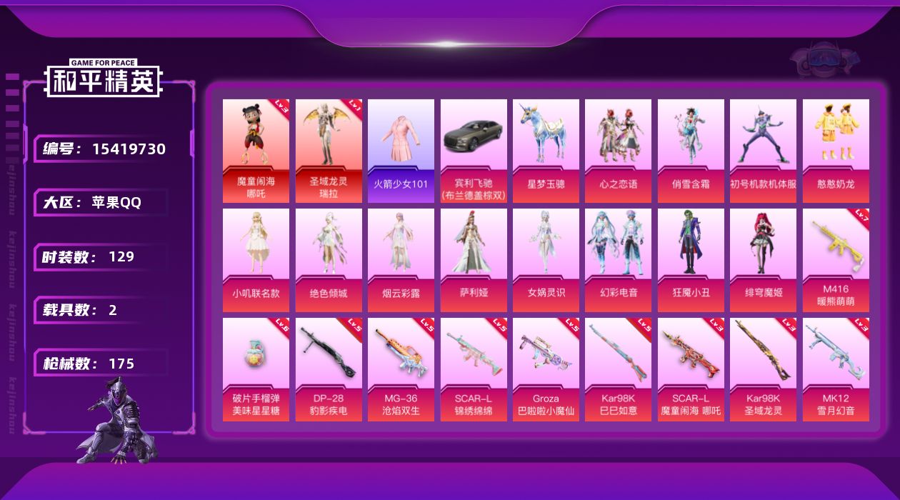 [15419730]732扭蛋碎片连体王者v10老101苹果 手Q-2神装-12粉装-10特效枪-2载具-6粉色飞行器-67134热力值-7王牌印记-129套装-175枪皮