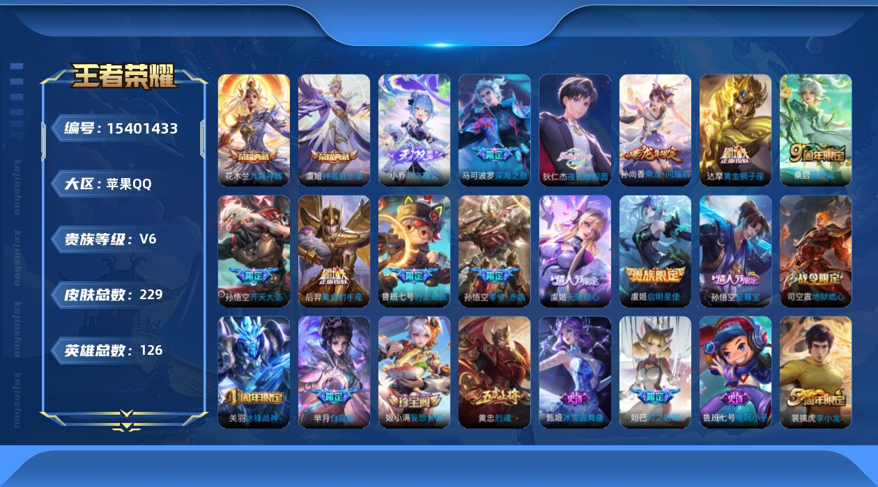 [15401433]【特价出售/店主推荐】苹果Q-V6-永恒钻石III段位-126英雄-229皮肤-2典藏皮肤-1无双-12传说-62史诗