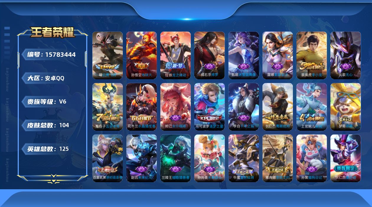 [15783444]安卓Q-V6-最强王者段位-125英雄-104皮肤-2传说-27史诗