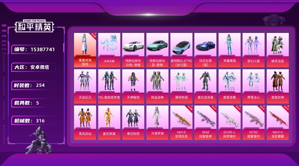[15387741]【特价出售/店主推荐】安卓 微信-1神装-16粉装-12特效枪-5载具-5粉色飞行器-11.4w热力值-20王牌印记-254套装-316枪皮 【红色神装等级】:魔童闹海-敖丙(二级) 【红色角色神装】:魔童闹海-敖丙 【热门品类】:粉装-梦幻火箭,套装-SS1特训,套装-龟仙人,套装-暗影哥特,套装-粉红小猪 【粉色套装】:粉装-精灵迷巫,粉装-梦幻火箭,粉装-天启纪元,粉装-PEL轰鸣竞梦者,粉装-天禅智恒,粉装-绚金战神,粉装-薄荷物语,角色-复仇流浪者,粉装-傲雪凌霜,粉装-霁雪冰心,粉装-霓裳武神,粉装-鸾凤武仙,粉装-盖世英雄,粉装-青空秋雨,角色-冷漠罗丽,角色-异瞳寒姬 【粉色枪皮等级】:AKM-炫紫旋律(七级),SCAR-L-童趣迷兔(一级),SCAR-L-纯梦嫁纱(七级),M416-至情至圣(九级),M762-甜蜜誓约(七级),Kar98K-巳巳如意(五级),M24-翩跹演武(二级),Mini14-龙虾霸霸(七级),DP-28-千金淑猫(一级),DP-28-豹影疾电(五级),MG-36-沧焰双生(五级),平底锅-喜羊羊与灰太狼(一级) 【粉色载具】:特斯拉Model 3(珍珠白),特斯拉Roadster(水滴蓝),路特斯ELETRE(冰川蓝),玛莎拉蒂Ghibli(蓝),僚机-萌兔起飞,冰绡玉鳞 【粉色枪皮】:AKM-炫紫旋律,SCAR-L-童趣迷兔,SCAR-L-纯梦嫁纱,M416-至情至圣,M762-甜蜜誓约,Kar98K-巳巳如意,M24-翩跹演武,Mini14-龙虾霸霸,DP-28-千金淑猫,DP-28-豹影疾电,MG-36-沧焰双生,平底锅-喜羊羊与灰太狼 【粉色飞行器】:精灵迷巫飞行器,梦幻火箭飞行器,千面幻镜飞行器,灵珠游龙飞行器,极意拳锋飞行器 【粉色降落伞】:快乐主宰降落伞,甜心宝贝降落伞,春暖花开降落伞,精灵迷巫降落伞,梦幻火箭降落伞,华贵君王降落伞,天启纪元降落伞,星之信仰降落伞,金风玉露降落伞,龙虾霸霸降落伞,神秘黑猫降落伞,古堡领主降落伞,甜蜜誓约降落伞,扶摇飞仙降落伞,锦绣火鲤降落伞,香水柠檬降落伞,洛神天依降落伞,筑梦精灵降落伞,环太平洋降落伞,绒雪飘舞降落伞,彩虹甜喵降落伞,青空秋雨降落伞,千金淑猫降落伞,月影灵韵降落伞,幻彩电音降落伞,喜羊羊与灰太狼降落伞,魔童闹海 敖丙降落伞,异瞳寒姬降落伞,极意拳锋降落伞 【