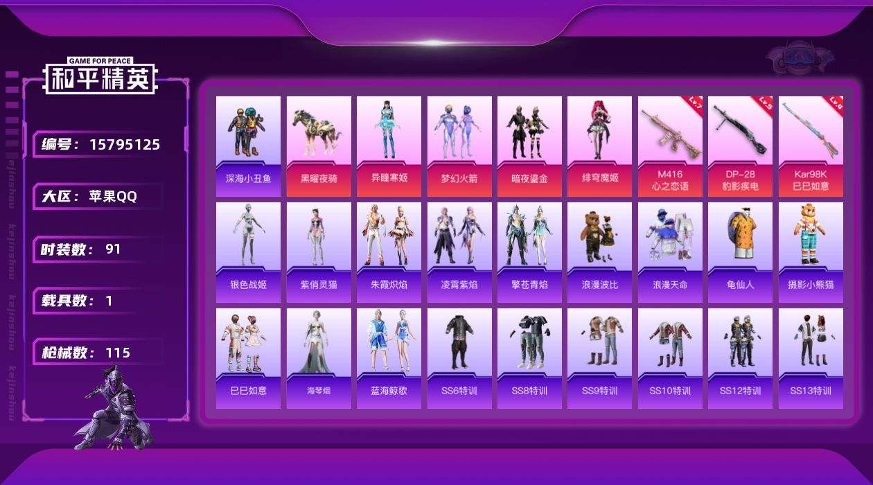 - [14740412]【店主推荐捡漏号!可直接换绑】苹果 手Q-4粉装-3特效枪-1载具-2粉色飞行器-38982热力值-4王牌印记-91套装-115枪皮【热门品类】:粉装-梦幻火箭,套装-浪漫天命,套装-深海小丑鱼,套装-龟仙人,套装-浪漫波比,套装-摄影小熊猫【粉色套装】:粉装-梦幻火箭,粉装-暗夜鎏金,角色-绯穹魔姬,角色-异瞳寒姬【粉色枪皮等级】:M416-心之恋语(七级),Kar98K-巳巳如意(四级),DP-28-豹影疾电(五级)【粉色载具】:黑曜夜骑【粉色枪皮】:M416-心之恋语,Kar98K-巳巳如意,DP-28-豹影疾电【粉色飞行器】:灵猫魔法师飞行器
