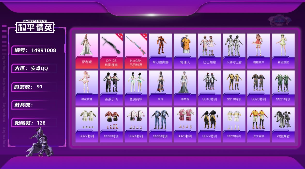 [14991008]【1647】安卓 手Q-1粉装-2特效枪-0载具-1粉色飞行器-32068热力值-3王牌印记-91套装-128枪皮 【热门品类】:角色-军刀雅典娜,套装-龟仙人 【粉色套装】:角色-萨利娅 【粉色枪皮等级】:Kar98K-巳巳如意(五级),DP-28-豹影疾电(五级) 【粉色枪皮】:Kar98K-巳巳如意,DP-28-豹影疾电 【粉色飞行器】:英伦信使飞行器 【稀有套装】:套装-龟仙人,套装-巳巳如意,套装-火种守卫者,套装-糖糖葫芦,套装-青团波波,套装-棉花软糖,套装-燕燕于飞,套装-鱼渊荷华,角色-风玲,角色-海琴烟 【稀有枪皮】:AKM-灼热熔岩,AKM-生命誓言,AKM-破晓战魂,AKM-龙的传人,M16A4-幻世战舞者,M16A4-红色方程式,M16A4-蓝色火焰,SCAR-L-玉兔迎春,SCAR-L-红色方程式,M416-糯团青竹,M416-红色方程式,M416-蓝色火焰,GROZA-彩虹符号,GROZA-田园牧歌,AUG-天降萌叽,AUG-耀粉歌者,AUG-月影灵韵,QBZ-彩虹符号,M762-天降萌叽,Mk47-妙红点点,G36C-桃粉嫣然,AC-VAL-天降萌叽,AC-VAL-魅影蝠王,蜜獾-天降萌叽,UZI-天降萌叽,UZI-炫彩节奏,UZI-红色方程式,UZI-诡夜天鹅,UMP45-生命誓言,UMP45-蓝色火焰,Vector-生命誓言,Vector-田园牧歌,Vector-创世·救赎,汤姆逊-天降萌叽,汤姆逊-炫彩节奏,汤姆逊-环太平洋,汤姆逊-耀粉歌者,汤姆逊-智趣喵喵,P90-巳巳如意,Kar98K-炫彩节奏,Kar98K-红色方程式,Kar98K-魅影蝠王,M24-炫彩节奏,SKS-炫彩节奏,VSS-田园牧歌,Mini14-涂山之恋,Mini14-炫彩节奏,Mini14-耀粉歌者,SLR-彩虹符号,AMR-妙红点点,AMR-喜羊羊与灰太狼,M200-惊鸿侠骨,S686-彩虹符号,S686-红色方程式,S686-巳巳如意,S1897-炫彩节奏,S12K-玩趣呆呆,S12K-破晓战魂,S12K-幻世战舞者,SPAS-12-田园牧歌,M249-妙红点点,M249-彩虹符号,M249-破晓战魂,M249-糯团青竹,DP-28-彩虹符号,MG3-妙红点点,MG3-幻世战舞者,R45-幻彩电音,蝎式手枪-千金淑猫,破片手榴弹-巳巳如意 【其他套