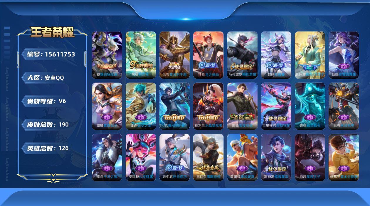 [15611753]安卓Q-V6-至尊星耀II段位-125英雄-190皮肤-1典藏-0珍品无双-0无双-0珍品传说-2传说-52史诗 【荣耀典藏】:铠银白咏叹调 【传说皮肤】:桑启鸣野蒿,后羿黄金射手座 【限定皮肤】:蒙犽顽岩魄,蔡文姬夏日便利店,虞姬夏日便利店,姜子牙天穹之誓,杨戬破阵退雄兵,狄仁杰阴阳师,赵云皇家上将,马可波罗暗影游猎,狄仁杰魔术师,项羽海滩派对,云中君纤云弄巧,上官婉儿梁祝,鲁班大师探海日志,阿古朵江河有灵,张良古海寻踪,蒙犽百解令,蒙恬荣光圣徽,高渐离燃音魔法,妲己灵卜魔法,鬼谷子天穹祈灯,沈梦溪龙舞盛年,刘邦剑破天穹,程咬金群星魔术团,周瑜熔金海岸 【赛季限定】:张良古海寻踪,鲁班大师探海日志,鬼谷子天穹祈灯,蒙恬荣光圣徽,刘邦剑破天穹,姜子牙天穹之誓 【战令限定】:蔡文姬夏日便利店,虞姬夏日便利店,马可波罗暗影游猎,高渐离燃音魔法,妲己灵卜魔法 【史诗皮肤】:项羽苍穹之光,露娜紫霞仙子,赵云皇家上将,貂蝉圣诞恋歌,甄姬冰雪圆舞曲,狄仁杰魔术师,廉颇地狱岩魂,宫本武藏鬼剑武藏,孙尚香水果甜心,嬴政暗夜贵公子,嬴政摇滚巨星,妲己魅力维加斯,吕布圣诞狂欢,曹操幽灵船长,李白千年之狐,吕布末日机甲,张飞乱世虎臣,花木兰水晶猎龙者,夏侯惇乘风破浪,诸葛亮黄金分割率,亚瑟心灵战警,雅典娜冰冠公主,安琪拉心灵骇客,百里守约特工魅影,铠曙光守护者,刘禅天才门将,李元芳逐浪之夏,白起星夜王子,阿轲节奏热浪,孙策猫狗日记,大乔猫狗日记,狄仁杰鹰眼统帅,上官婉儿梁祝,马可波罗暗影游猎,云中君纤云弄巧,阿古朵江河有灵,蒙犽百解令,周瑜雪夜绮愿,妲己灵卜魔法,高渐离燃音魔法,蒙恬荣光圣徽,黄忠怒海争锋,蔡文姬夏日便利店,蒙犽顽岩魄,姬小满战舞者,亚连破空之剑,百里守约百相守梦,牛魔星界战将,孙膑茶境仙,弈星万物之道,赵怀真器灵浮梦炉,阿轲化蝶舞,狂铁龙之律动 【其他皮肤】:项羽海滩派对,韩信教廷特使,赵云白执事,赵云忍炎影,芈月红桃皇后,牛魔西部大镖客,孙膑天使之翼,妲己少女阿狸,典韦黄金武士,亚瑟死亡骑士,达摩拳王,花木兰兔女郎,张飞五福同心,甄姬花好人间,后羿阿尔法小队,狄仁杰阴阳师,刘备纽约教父,刘备汉昭烈帝,李元芳黑猫爱糖果,关羽龙腾万里,钟无艳海滩丽影,王昭君幻想奇妙夜,狂铁命运角斗场,老夫子功夫老勺,牛魔制霸全明星,诸葛亮掌控之力,李白敏锐之力,鬼谷子幻乐之宴,大乔守护