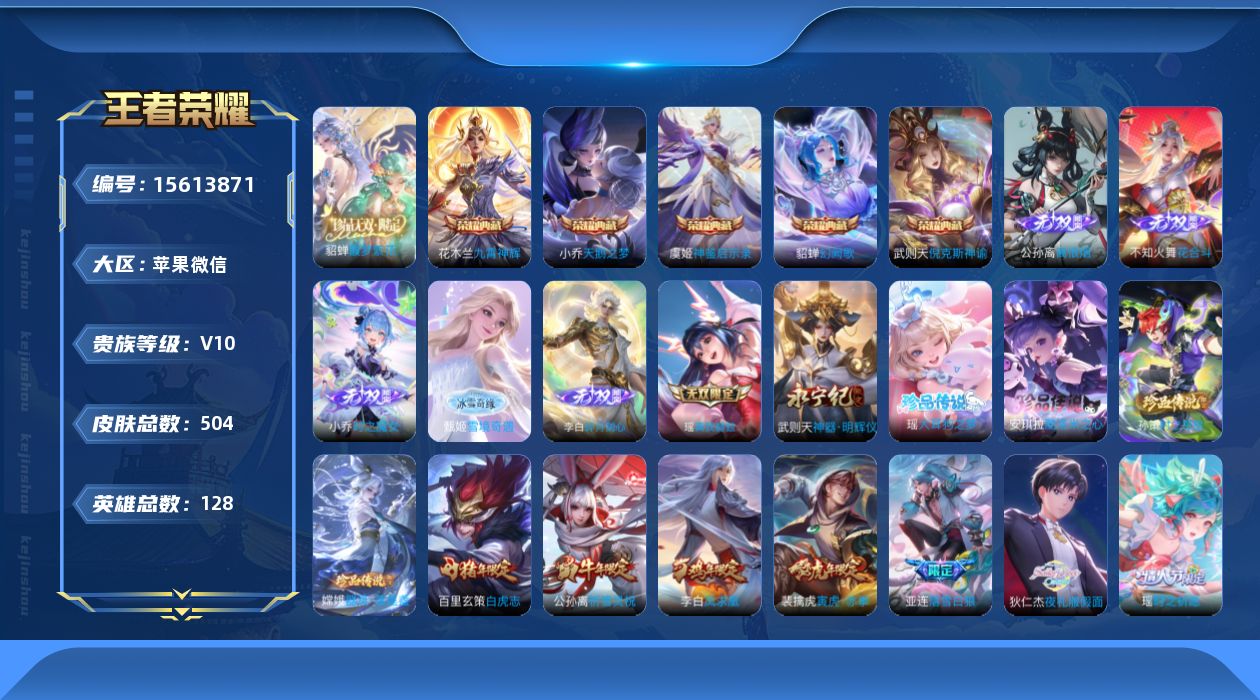 [15613871]小国西施米莱迪貂蝉猪八戒嫦娥-中路81段-对抗50段-苹果WX-V10-最强王者段位-128英雄-503皮肤-5典藏皮肤-1典藏英雄-1珍品无双-7无双-4珍品传说-52传说-166史诗 【英雄全皮】:武则天全皮,露娜全皮,刘邦全皮,不知火舞全皮,杨玉环全皮,太乙真人全皮,沈梦溪全皮,猪八戒全皮,上官婉儿全皮,嫦娥全皮,马超全皮,镜全皮,阿古朵全皮,金蝉全皮,影全皮,海诺全皮,少司缘全皮 【荣耀典藏】:武则天英雄,武则天倪克斯神谕,小乔天鹅之梦,花木兰九霄神辉,貂蝉幻阙歌,虞姬神鉴启示录 【珍品无双】:貂蝉馥梦繁花 【无双皮肤】:武则天神器明辉仪,瑶真我赫兹,李白碎月剑心,小乔时之魔女,不知火舞花合斗,公孙离离恨烟,甄姬雪境奇遇 【珍品传说】:孙策时之奇旅,嫦娥器灵落星盏,瑶大耳狗之梦,安琪拉酷洛米之心 【传说皮肤】:后羿神树通天,杨玉环星之鸣奏,云缨幻光神枪,裴擒虎祥瑞亨通,桑启鸣野蒿,庄周牧神诗旅,朵莉亚心动手记,亚连落雪白狼,吕布曦玄引,貂蝉曦玄引,孙尚香乘龙问璇玑,孙策乘龙淬吴钩,赵云乘龙铭钟鼎,马超琥珀纪元,铠琥珀纪元,艾琳觅芳踪,露娜霜月吟,狄仁杰夜礼服假面,王昭君永恒水手月亮,云缨鹤归松栖,上官婉儿妄想奇谈,不知火舞绯月行,马超无双飞将,孙策挚爱之约,露娜启示之音,瑶时之祈愿,裴擒虎寅虎赤拳,鲁班七号寅虎瑞焰,孙尚香异界灵契,赵云淬星耀世,王昭君乞巧织情,西施游龙清影,李元芳飞鸢探春,兰陵王默契交锋,公孙离祈雪灵祝,诸葛亮时雨天司,镜炽阳神光,虞姬启明星使,关羽武圣,貂蝉猫影幻舞,虞姬云霓雀翎,百里玄策白虎志,后羿黄金射手座,杨戬永曜之星,诸葛亮武陵仙君,貂蝉仲夏夜之梦,李白凤求凰,孙尚香末日机甲,宫本武藏地狱之眼,孙悟空地狱火,吕布天魔缭乱,武则天海洋之心 【限定皮肤】:白起狰,公孙离离恨烟,蔡文姬夏日便利店,大乔绒语心约,虞姬夏日便利店,姜子牙天穹之誓,狄仁杰阴阳师,小乔纯白花嫁,虞姬凯尔特女王,赵云皇家上将,赵云龙胆,墨子神迹守卫,嬴政白昼王子,孙尚香异界灵契,鲁班七号狮舞东方,鲁班七号寅虎瑞焰,庄周蜃楼王,庄周云端筑梦师,庄周高山流水,高渐离死亡摇滚,高渐离玩趣恶龙,阿轲迷踪丽影,钟无艳超时空战士,孙膑妖精王,孙膑天狼运算者,孙膑寅虎展翼,扁鹊炼金王,扁鹊奇幻香踪,白起夜都怪侠,芈月重明,芈月白晶晶,芈月幻夜卜梦,吕布天魔缭乱,吕布猎兽之王,