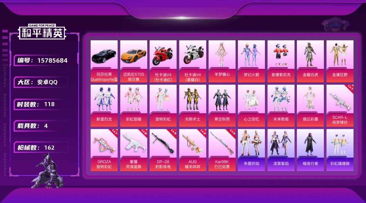 - [15080255]【店主推荐捡漏号!可直接换绑】安卓 手Q-4粉装-7特效枪-2载具-2粉色飞行器-3.7w热力值-7王牌印记-70套装-125枪皮【热门品类】:角色-军刀雅典娜【粉色载具】:僚机-冰龙团团,冰绡玉鳞【粉色套装】:粉装-绚金战神,角色-智耀战神,角色-冷漠罗丽,角色-羊梦糖心【粉色枪皮等级】:GROZA-镜光银凌(五级),AKS-74U-星穹咏叹调(七级),Kar98K-巳巳如意(五级),AMR-智耀战神(四级),SVD-月影灵韵(六级),DP-28-豹影疾电(五级),MG-36-沧焰双生(五级)【粉色飞行器】:终晖之翼飞行器,灵珠游龙飞行器