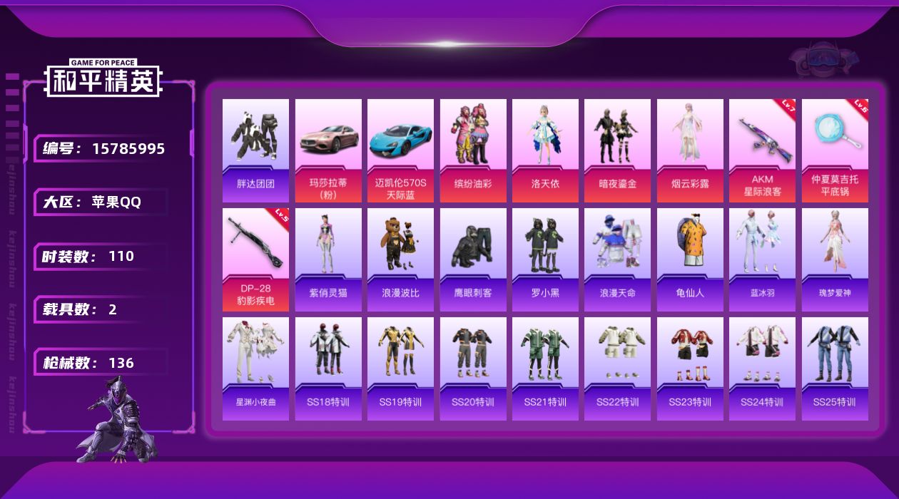 - [16329115]【店主推荐捡漏号!可直接换绑】苹果 手Q-2粉装-4特效枪-0载具-1粉色飞行器-47138热力值-12王牌印记-117套装-173枪皮【热门品类】:套装-龟仙人,套装-粉红小猪【粉色套装】:角色-圣堂之誓,粉装-星穹咏叹调【粉色枪皮等级】:Kar98K-巳巳如意(五级),AMR-智耀战神(五级),MK20-H-海螺星光(六级),DP-28-千金淑猫(四级)【粉色枪皮】:Kar98K-巳巳如意,AMR-智耀战神,MK20-H-海螺星光,DP-28-千金淑猫【粉色飞行器】:星之彼岸飞行器