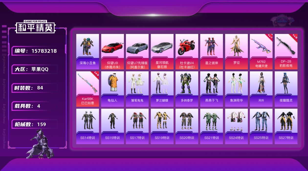 - [15097217]【暑期末清货/特价急出/永久包赔】:苹果 手Q-22粉装-8特效枪-6载具-10.5w热力值-15印记-228套装-273枪皮【热门品类】:套装-深海小丑鱼,套装-小丑鱼,套装-奇异狩猎者,套装-动感兔斯基人偶服【稀有载具】:特斯拉Roadster(沁心粉),玛莎拉蒂Ghibli(粉),宾利BATUR(星火红),Formula E Gen2(幽光蓝),萌喵橘座,晶梦灵驹【稀有载具等级】:宾利BATUR(星火红)(二级)【特效枪等级】:AKM-梦之光华(六级),SCAR-L-童趣迷兔(七级),M416-心之恋语(七级),UMP45-恐龙拽拽(七级),Kar98K-伏魔团(五级),Kar98K-巳巳如意(五级),SLR-暗夜玫瑰(五级),SPAS-12-蜜语绒猫(三级)【优质套装】:粉装-粉色回忆,粉装-雪国幻梦,粉装-梦幻火箭,粉装-华贵君王,粉装-彗云及圣,粉装-炙焰红王,粉装-暗夜玫瑰,粉装-彩虹鹿灵,粉装-山涧鹿灵,粉装-蓝莓炮弹,粉装-寒光使者,粉装-闲梦青缨,角色-茉莉星,粉装-繁龙极客,套装-创世·救赎,角色-初号机 觉醒Ver.,角色-千金淑猫,角色-伏羲圣卦,角色-女娲灵识,角色-晶梦幻蝶,粉装-幻彩电音,角色-荧海星豚【优质飞行器】:酣梦熊熊飞行器,伏魔团飞行器,相思残雪飞行器,繁龙极客飞行器
