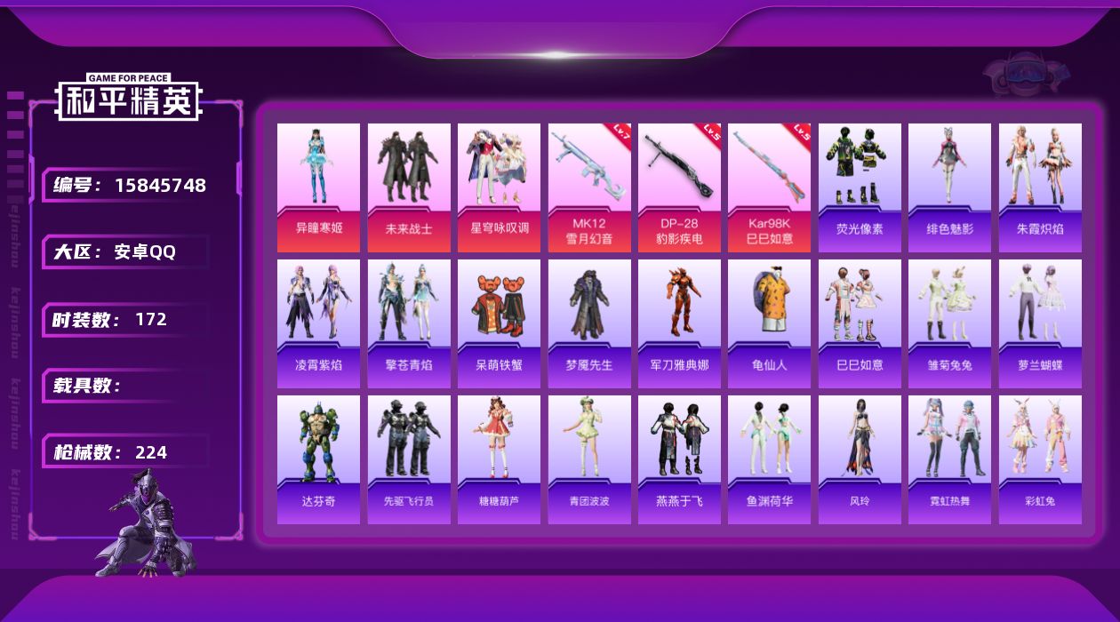 [15845748]【1699】安卓 手Q-3粉装-3特效枪-0载具-3粉色飞行器-62045热力值-16王牌印记-172套装-224枪皮 【热门品类】:角色-军刀雅典娜,套装-龟仙人 【粉色套装】:粉装-未来战士,粉装-星穹咏叹调,角色-异瞳寒姬 【粉色枪皮等级】:Kar98K-巳巳如意(五级),MK12-雪月幻音(七级),DP-28-豹影疾电(五级) 【粉色枪皮】:Kar98K-巳巳如意,MK12-雪月幻音,DP-28-豹影疾电 【粉色飞行器】:繁龙极客飞行器,星空武士飞行器 【粉色降落伞】:垂柳戏鸭降落伞,闲梦青缨降落伞,炫光之旅降落伞,莲影清波降落伞,圣堂之誓降落伞,创世·救赎降落伞,守护天翼降落伞,英伦信使降落伞,千金淑猫降落伞,雪月幻音降落伞,星穹咏叹调降落伞,幻星舰长降落伞,极意拳锋降落伞,炫彩糖果降落伞 【稀有套装】:套装-龟仙人,套装-巳巳如意,套装-荧光像素,套装-雪国风尚,套装-炫彩糖果,套装-雏菊兔兔,套装-萝兰蝴蝶,角色-达芬奇,套装-先驱飞行员,套装-糖糖葫芦,套装-青团波波,套装-燕燕于飞,套装-鱼渊荷华,角色-风玲,套装-霓虹热舞,套装-彩虹兔,套装-云朵鹅,套装-雪绒豹,角色-夜瞳黯灵,套装-朱霞炽焰,套装-凌霄紫焰,套装-擎苍青焰,角色-绯色魅影 【稀有枪皮】:M79短管榴弹-钛晶裂爪,AUG-冰晶雪宝,AKM-彩虹符号,AKM-影袭,AKM-星之彼岸,AKM-灼热熔岩,AKM-破晓战魂,AKM-虎虎生威,AKM-龙的传人,M16A4-幻世战舞者,M16A4-红色方程式,M16A4-蓝色火焰,SCAR-L-夜灯,SCAR-L-炫彩节奏,SCAR-L-玉兔迎春,SCAR-L-红色方程式,SCAR-L-净心行者,M416-糯团青竹,M416-红色方程式,M416-蓝色火焰,AUG-天降萌叽,AUG-怪笑疯兔,AUG-甜蜜菠萝,AUG-耀粉歌者,QBZ-彩虹符号,M762-天降萌叽,M762-奇异狩猎者,M762-云朵鹅,M762-幻影飞狐,AC-VAL-天降萌叽,AC-VAL-快闪甜心,蜜獾-天降萌叽,蜜獾-娇憨猪猪,ACE32-蓝晶绮麟,ARX-凌霄紫焰,UZI-啾咪啾咪,UZI-天降萌叽,UZI-娇憨猪猪,UZI-炫彩节奏,UZI-红色方程式,UMP45-夜灯,UMP45-涂山之恋,UMP45-生命誓言,UMP45-蓝色火焰,UMP45-金玉无双,