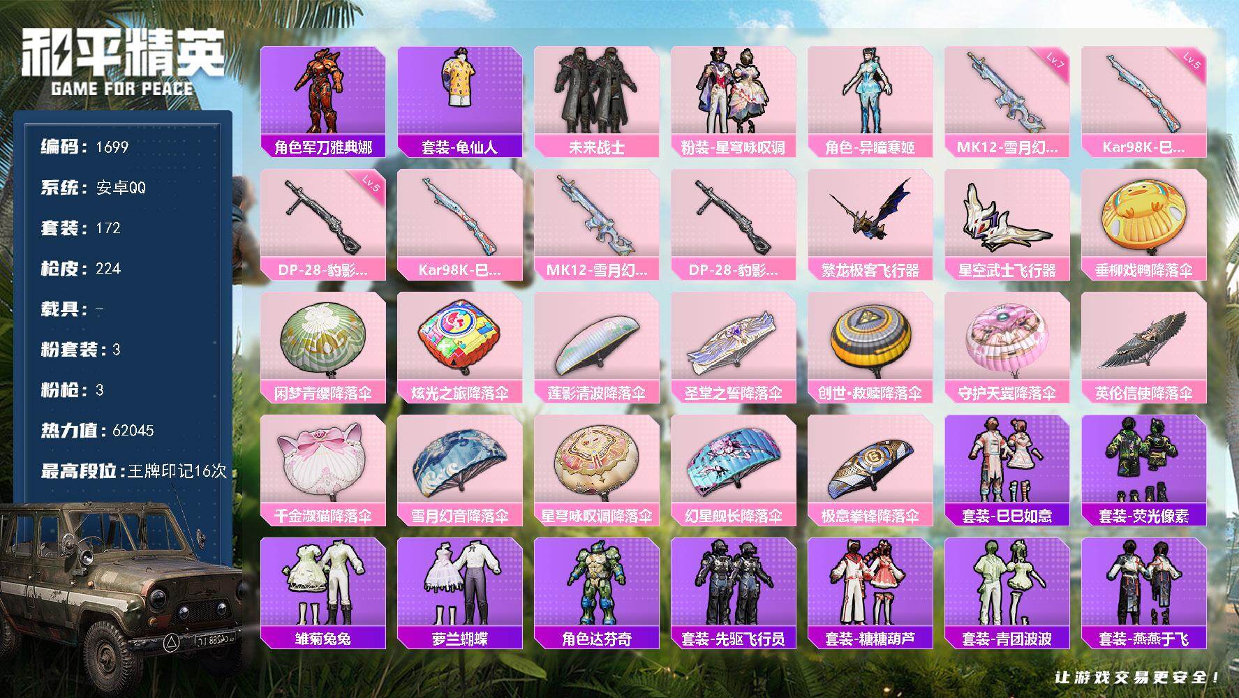 [15845748]【1699】安卓 手Q-3粉装-3特效枪-0载具-3粉色飞行器-62045热力值-16王牌印记-172套装-224枪皮