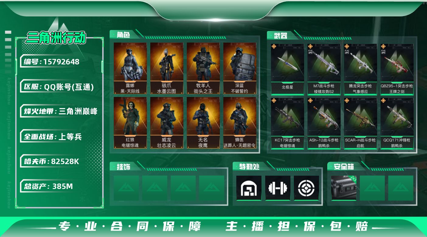 [15792648]【店主推荐捡漏号!可直接换绑】总资产385m 82528k哈伏币-326m流动资产-60烽火等级-三角洲巅峰-50战场等级-上等兵