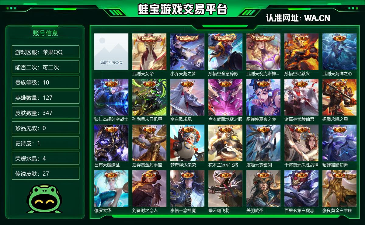 苹果QQ 可二次 贵族10 段位荣耀黄金I 皮肤价值293818 英雄数量127 皮肤数量347 荣耀水晶4 传说皮肤27 珍品0 限定皮肤55 无双皮肤0 内测4 赛季皮肤28 史诗皮肤48 普通皮肤32 其他273