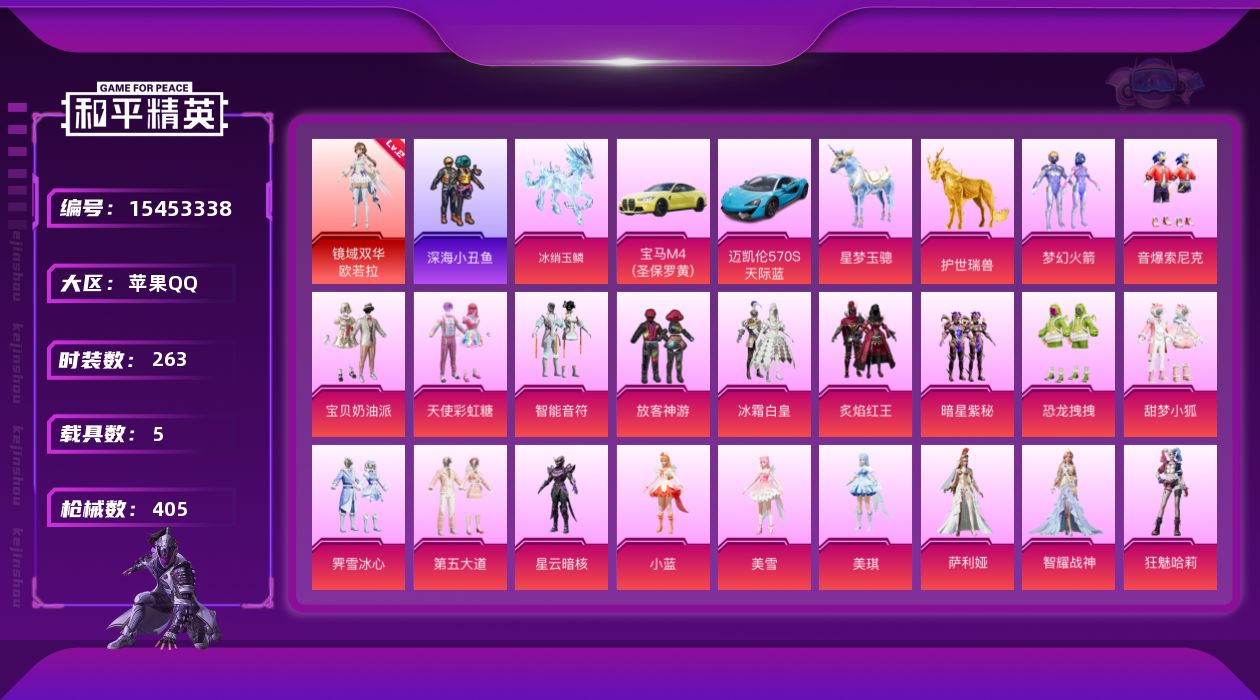 - [15401609]可二次【店主推荐捡漏号!可直接换绑】苹果 手Q-无敌战神框-1神装-16粉装-13特效枪-4载具-9粉色飞行器-82377热力值-10王牌印记-157套装-225枪皮【红色神装等级】:镜域双华-欧若拉(四级)【红色角色神装】:镜域双华-欧若拉【热门品类】:粉装-梦幻火箭,粉装-繁龙极客,套装-都市猎人,套装-派对舞王,套装-深海小丑鱼,套装-小丑鱼,套装-奇异狩猎者,套装-龟仙人,套装-粉红小猪【粉色载具】:路特斯ELETRE(冰川蓝),布加迪威龙(海洋蓝),杜卡迪 Panigale V4(杜卡迪红),星梦玉骢【粉色套装】:粉装-极限特训,粉装-宝贝奶油派,粉装-天使彩虹糖,粉装-梦幻火箭,角色-洛天依,粉装-沙场疾风,角色-白勺歌姬,角色-呆萌星弥,粉装-粉樱探戈,粉装-繁龙极客,角色-烟云彩露,角色-小蓝,角色-光极星,角色-樱桃泡泡,粉装-星穹咏叹调,角色-异瞳寒姬【粉色枪皮等级】:AKM-甜心宝贝(五级),AKM-幽焰骑士(三级),SCAR-L-锦绣绵绵(五级),M416-暖熊萌萌(六级),M416-电玩时刻(五级),M416-墨龙九天(一级),M762-电糖天使(四级),UMP45-量子极限(五级),AKS-74U-星穹咏叹调(四级),P90-沙丘之主(三级),Kar98K-巳巳如意(五级),M24-镜域双华(三级),DP-28-豹影疾电(五级)【粉色枪皮】:AKM-甜心宝贝,AKM-幽焰骑士,SCAR-L-锦绣绵绵,M416-暖熊萌萌,M416-电玩时刻,M416-墨龙九天,M762-电糖天使,UMP45-量子极限,AKS-74U-星穹咏叹调,P90-沙丘之主,Kar98K-巳巳如意,M24-镜域双华,DP-28-豹影疾电【粉色飞行器】:星夜魔法师飞行翼,沙丘之主天马,繁龙极客飞行器,镜域双华-灵镜之阶,龙翔九天飞行器,幻海精灵飞行器,灵珠游龙飞行器